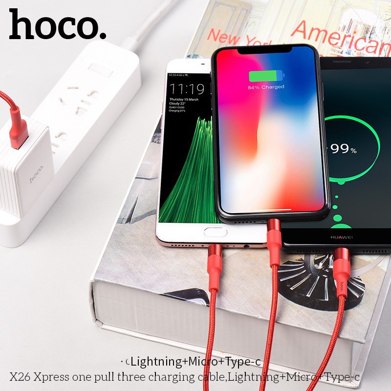 Cáp sạc HOCO X26 3 in 1 (Iphone/Android/Type-C)Cáp sạc dây dù chống đứt 3 đầu Hoco X26 Lightning+Micro+Type-C 1M
