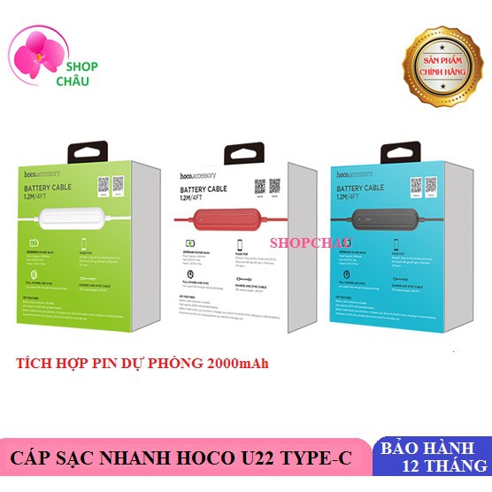 Cáp Sạc Hoco U22 typeC Chính Hãng Tích Hợp Pin Sạc Dự Phòng 2000mAhBảo hành: 12 tháng chính hãng, lỗi 1 đổi 1 trong tháng đầu tiên sử dụng.