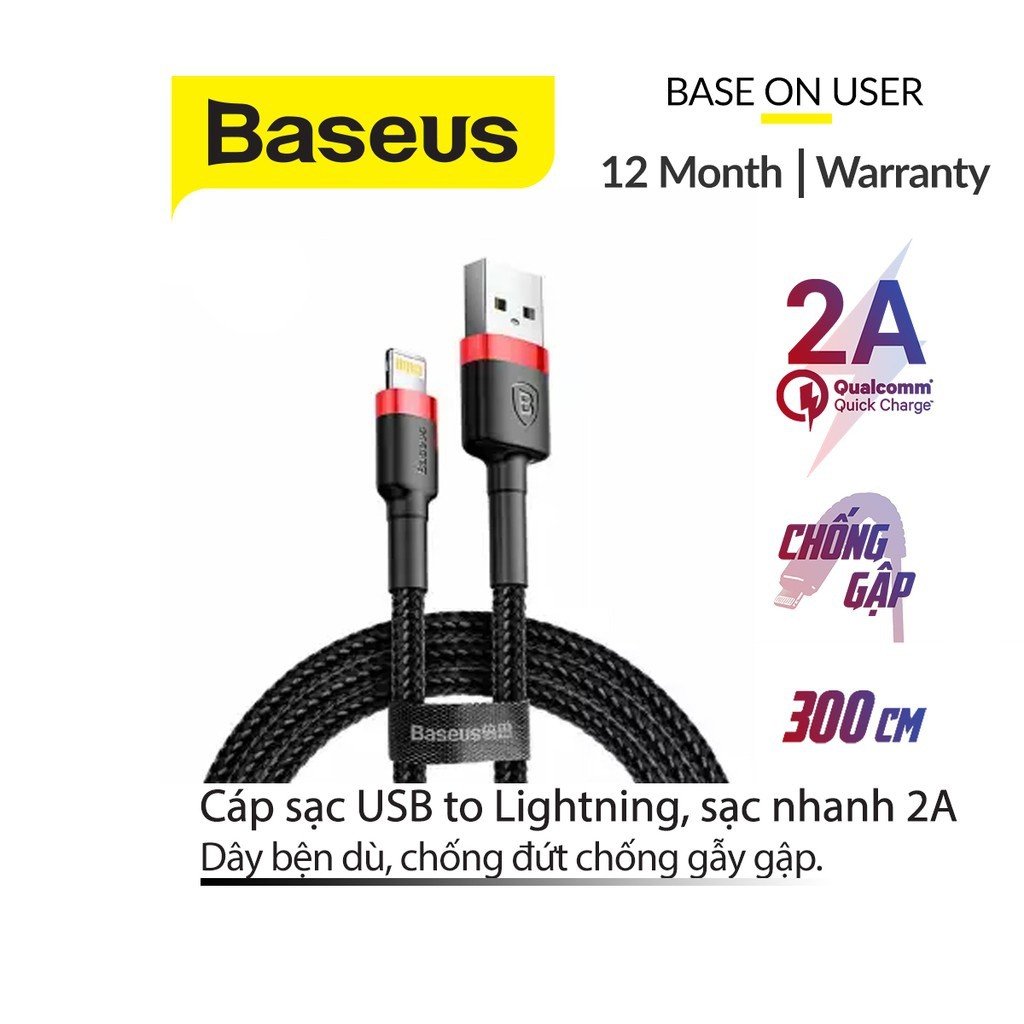 Cáp sạc nhanh Baseus Cafule Lightning dây bện dù chắc chắn hỗ trợ truyền dữ liệu dài 1M/2M/3M cho iPhone/iPad"Bảo hành: 12 tháng, 1 đổi 1 trong tháng đầu nếu lỗi do nhà sản xuất.