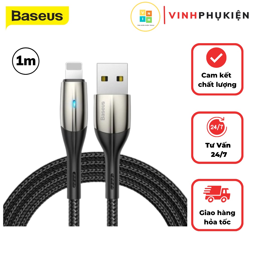 Cáp sạc nhanh iphone ipad dây bọc dù chống gãy gập có đèn led báo hỗ trợ truyền dữ liệu 1 mét chính hãng baseus