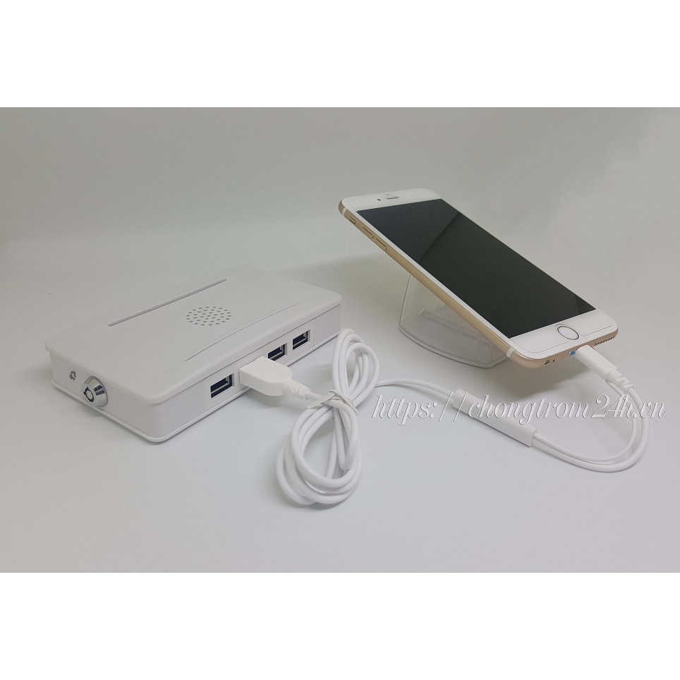 Lưu ý : Để sử dụng được, cần mua thêm bộ trung tâmĐược sử dụng để sạc ( hoặc không sạc ) và chống trộm cho các dòng iphone, ipad, samsung, macbook, laptop đời mới ( Chân Lightling ). Một đầu USB cắm vào CỔNG CHỐNG TRỘM TRUNG TÂM và đầu còn lại cắp vào chân sạc của điện thoại.