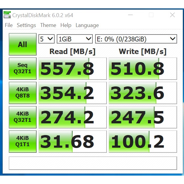- Tốc độ 550Mb/s là tốc độ lý tưởng, trên thực tế còn phụ thuộc vào phân vùng, ổ ssd và main, phân vùng cài win tốc độ đọc sẽ chậm hơn phân vùng không lưu trữ gì