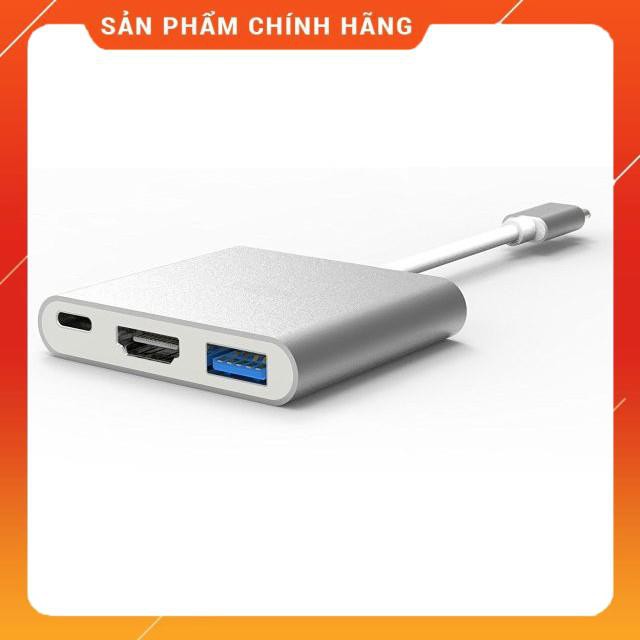 Hub USB Type C 3 in 1 - Type C to HDMI + USB 3.0 + Type C (power)Sử dụng để kết nối Macbook, điện thoại, máy tính bảng cổng Type C với màn hình TV máy chiếu Projector cổng HDMI