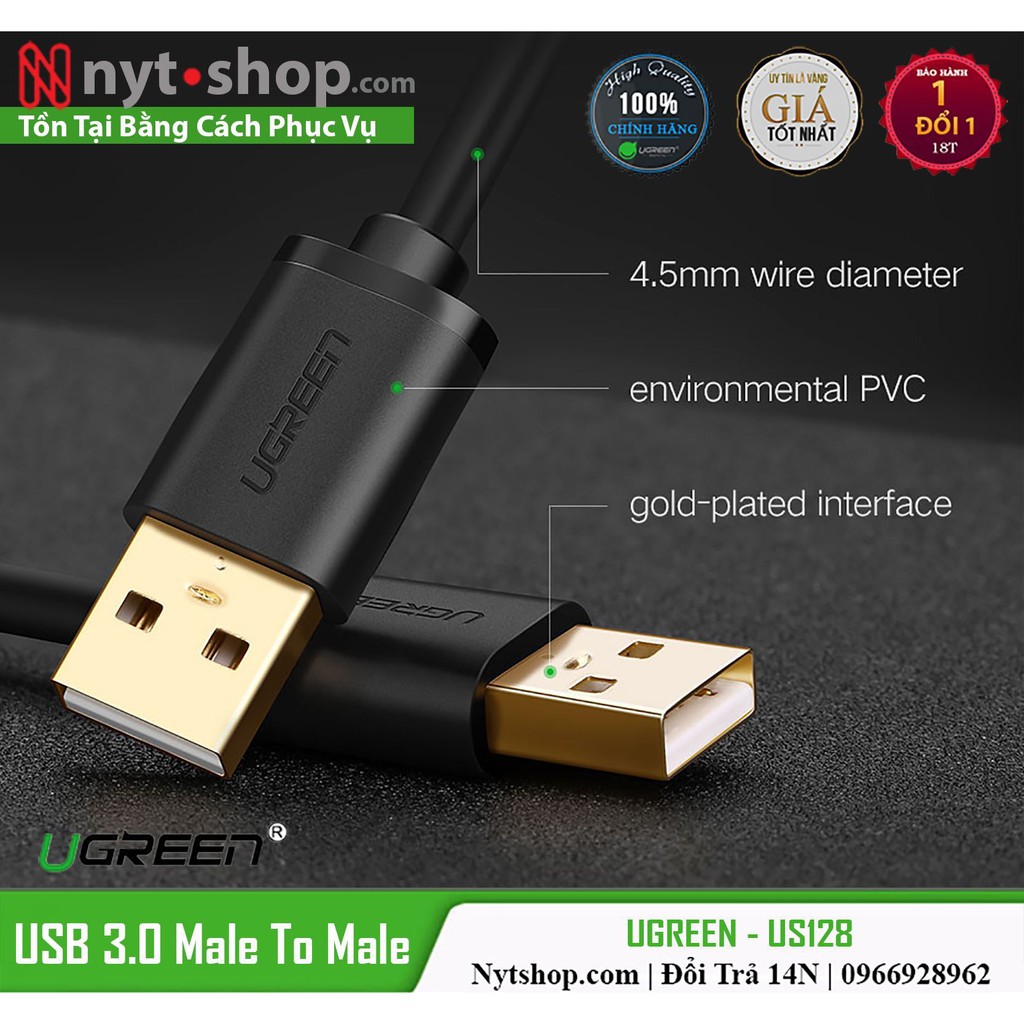 - Cáp USB 3.0 Male To Male Cao Cấp UGREEN US128 là dòng sản phẩm USB 3.0 chất lượng cao trên thị trường hiện nay, dùng để kết nối Laptop, PC, smart TV... với đầu đọc thẻ nhớ, ổ cứng, HUB USB, Webcom, USB camera, máy in... với tốc độ truyền tín hiệu lên đến 5Gbps.