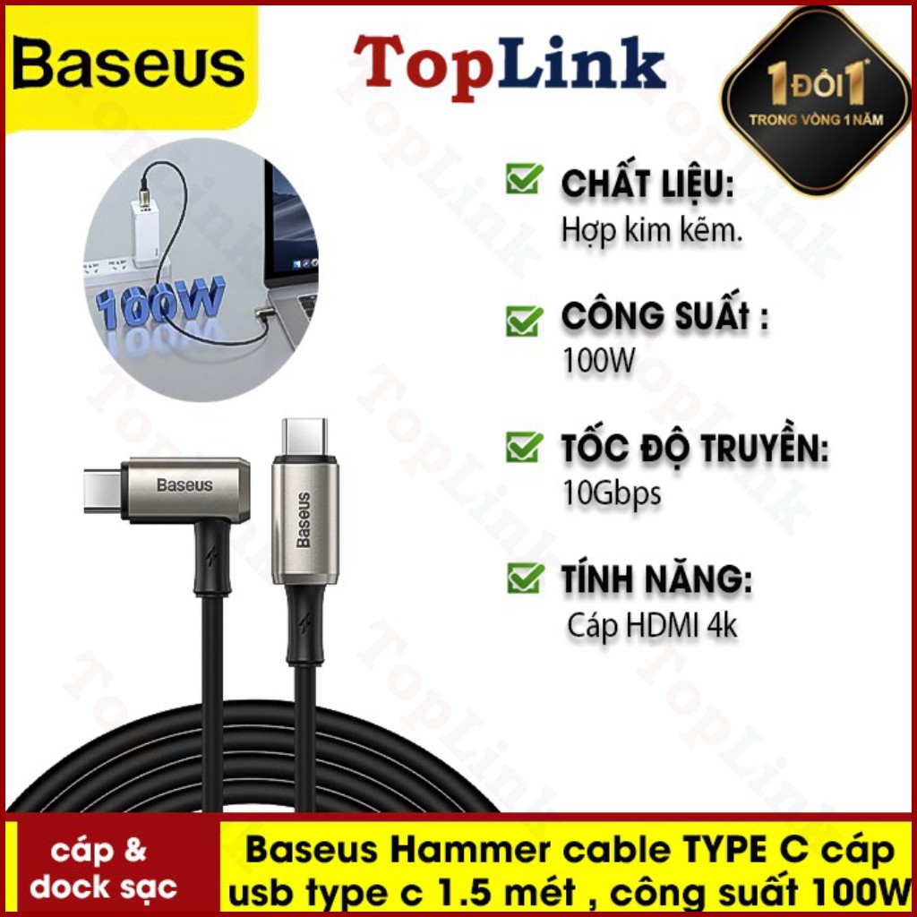 Cáp USB Baseus Hammer Cable TYPE C 1.5 Mét , Công Suất 100W Tốc Độ Truyền Tải 10Gbps. Cho Macbook Ipad Pro Dây Cáp Sạc Nhanh Quick Charge 4.0Chào mừng bạn đến với TOPLINK - Thế Giới Phụ Kiện