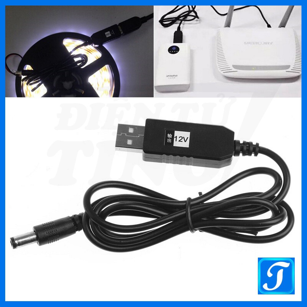 Cáp USB chuyển đổi 5V sang 9V / 12V (Mất điện vẫn có Mạng & WiFi)Cáp sạc chuyển đổi dòng điện có đầu cắm vào dạng cổng USB 5V DC sang 12V DC có đầu ra cổng tròn có đường kính ngoài 5.5mm, đường kính phía trong 2.5/ 2.1mm dùng cho các loại thiết bị điện như bộ phát wifi ... ngoài ra có tương thích với các thiết bị khác có cùng kích cỡ cổng sạc như đèn pin, bộ phát wifi...