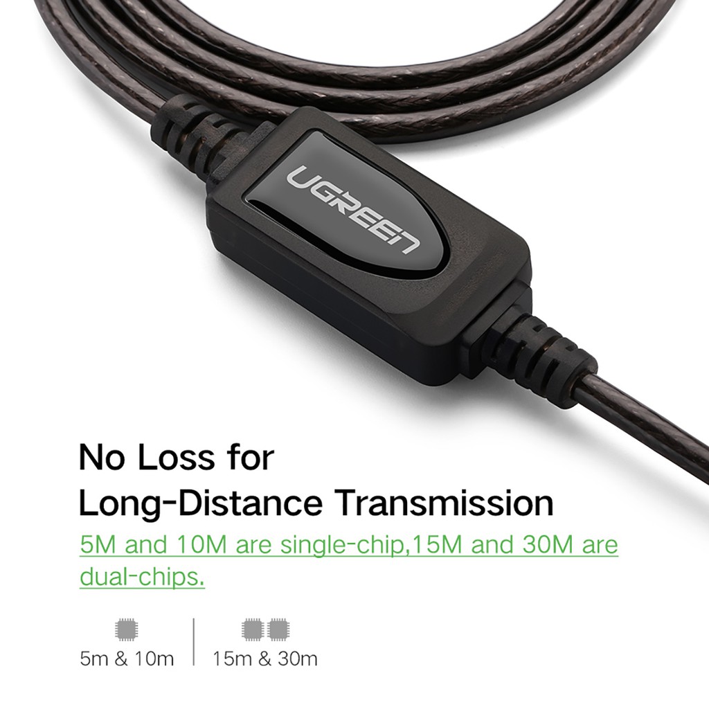 - Cáp USB nối dài 5m có chíp khuếch đại chính hãng Ugreen UG-10319 có thể được sử dụng để mở rộng các thiết bị USB của bạn, như máy in USB, loa, máy quét, bàn phím, wifi, vv lên đến 10-30m mà không bị mất tín hiệu đáng kể hoặc giảm chất lượng.