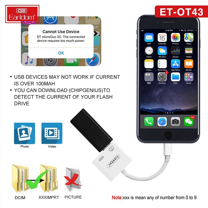 - Với nhu cầu trên chúng tôi xin giới thiệu dòng sản phẩm Jack Chuyển Từ Cổng Lightning Sang 1 Cổng USB và 1 Cổng Lightning Earldom OT-43 với chức năng chính là chuyển đổi hình ảnh từ những chiếc USB, đầu đọc thẻ nhớ các loại ra chiếc iPad/iPhone của bạn