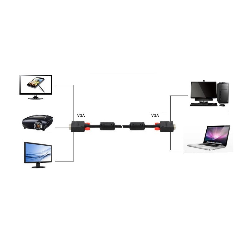 Dây cáp VGA có 15 chân kết nối, hỗ trợ nhiều chuẩn độ phân giải 640x400px, 1280x1024px, hiện nay có thể lên đến 1920x1080 px (FullHD), 2048x1536px.