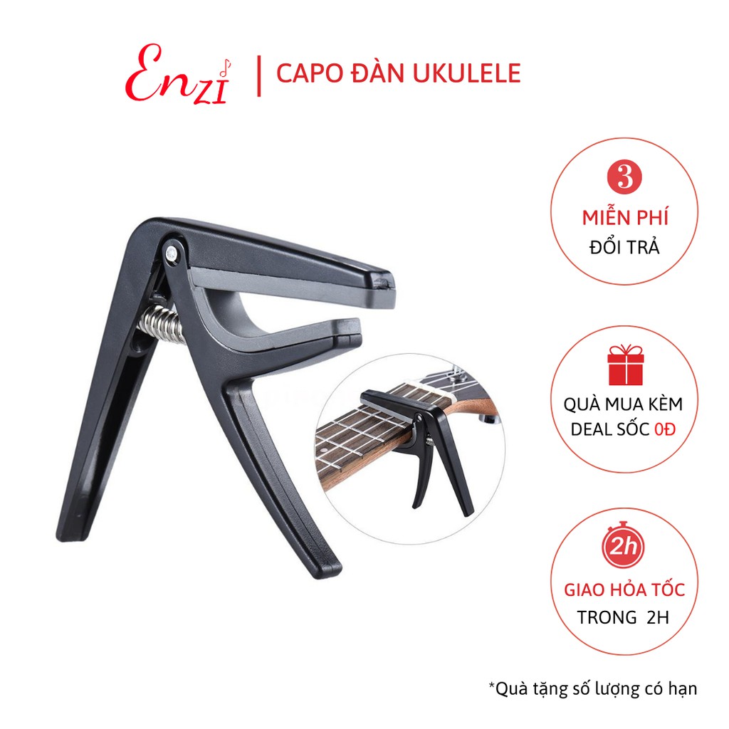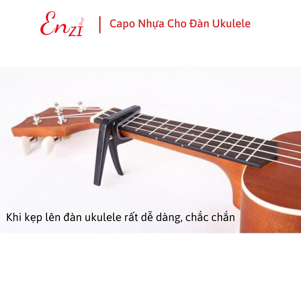 Capo cho đàn ukulele dành riêng đàn ukulele chất liệu nhựa EnziCũng như trên đàn Guitar, capo là một phụ kiện khá phổ biến với người chơi đàn Ukulele, tác dụng và cách sử dụng của nó giống hệt trên đàn Guitar. Khi kẹp vào cần đàn, nó sẽ làm ngắn dây đàn tạm thời, hành động này làm tăng cao độ của âm thanh mà đàn phát ra, càng kẹp lên cao thì cao độ càng tăng lên.