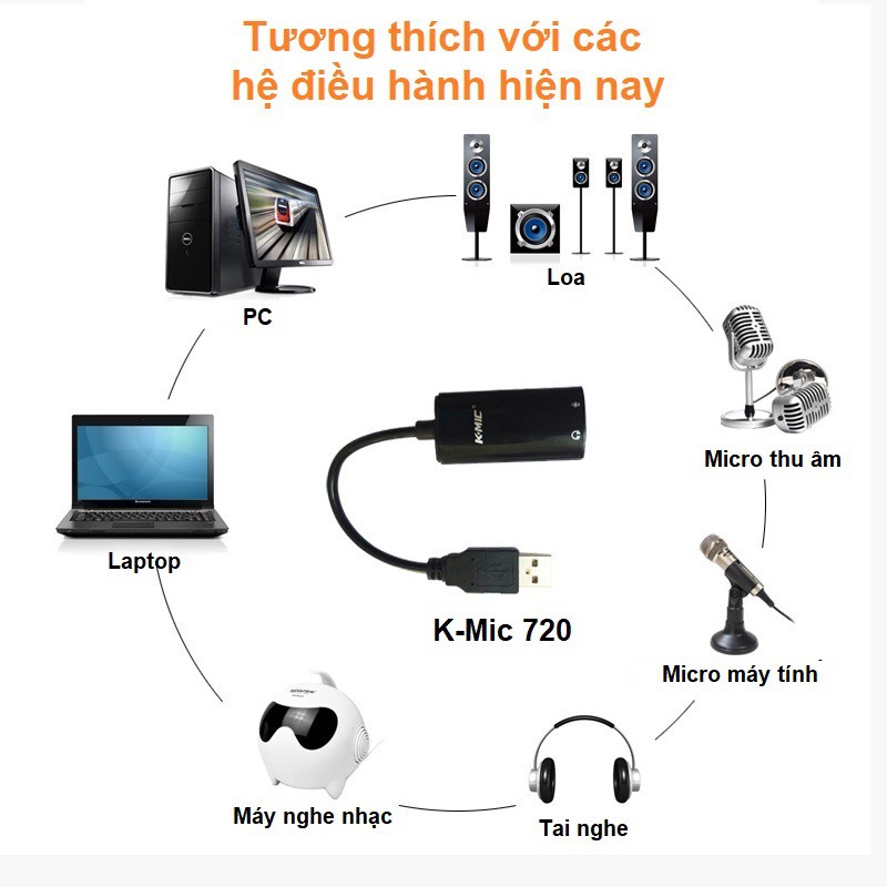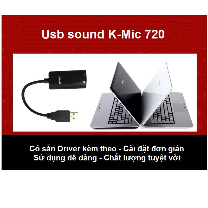 K-Mic KM720 là sound card usb gắn ngoài cho máy tính, laptop, sử dụng chip âm thanh của Creative cho chất lượng âm thanh tốt hơn hẳn sound onboar trên các dòng laptop giá rẻ. K-Mic KM720 sử dụng tốt với tai nghe hoặc loa máy tính để nghe nhạc, xem phim, chơi game hoặc kết nối micro máy tính để chat voice, skype, hát karaoke online, thu âm.TÍNH NĂNG CƠ BẢN