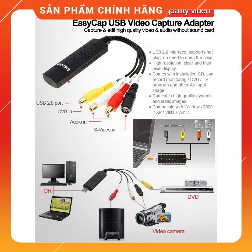 Card ghi hình USB EasycapDây cáp EasyCap là thiết bị chuyển video được nối máy tính của bạn đến thiết bị chứa video bằng kết nối RCA hoặc kết nối S-Video, như VCR, DVD, TV, camera. Sử dụng EasyCap để chuyển, ghi VHS sang thiết bị khác hoặc máy tính và ghi ra DVD. Lưu trữ, đọc những video của bạn từ máy quay cũ, hoặc di chuyển các video tới các thiết bị khác nhau. Hãy trải nghiệm khả năng vô tận của EasyCap USB 2.0!