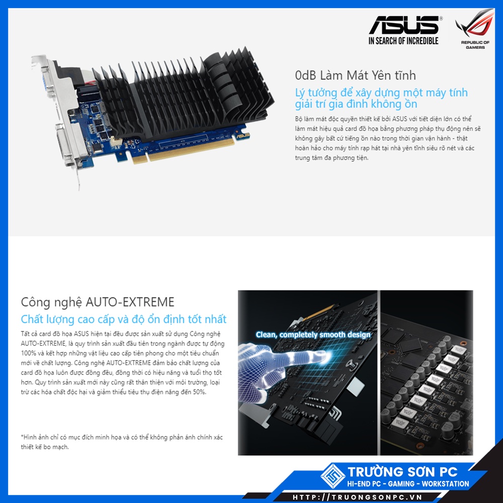 - Thiết kế làm mát hoàn hảo để xây dựng một hệ thống PC kín. Tản nhiệt được ASUS thiết kế độc quyền với diện tích bề mặt lớn nhằm tăng hiệu quả làm mát cho các card đồ họa một cách thụ động. Nhờ đó, nó hoàn toàn không phát ra âm thanh gây ồn khi chạy. Đây chính là sự lựa chọn hoàn hảo cho các trung tâm đa phương tiện đòi hỏi sự im lặng và các dàn máy tính PC gia đình.