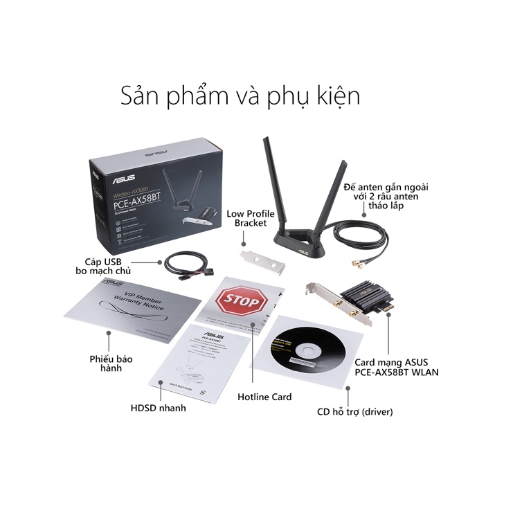 Máy tính & Laptop > Thiết Bị Mạng > Bộ Thu Wifi || Card mạng wifi PCI Express Asus PCE-AX58BT chuẩn ax - Chuẩn WiFi 6 (802.11ax)Còn hàng