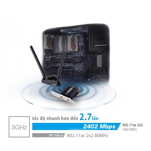 📌 Với công nghệ Wi-Fi 6 (802.11ax) và băng thông 160 MHz, ASUS PCE-AX58BT cho tốc độ không giây nhanh hơn 2,7 lần so với các thiết bị Wi-Fi 5 (802.11ac). Sự kết hợp mang tính cách mạng của công nghệ OFDMA và MU-MIMO đảm bảo kết nối Wi-Fi hiệu quả nhất đối với PC của bạn
