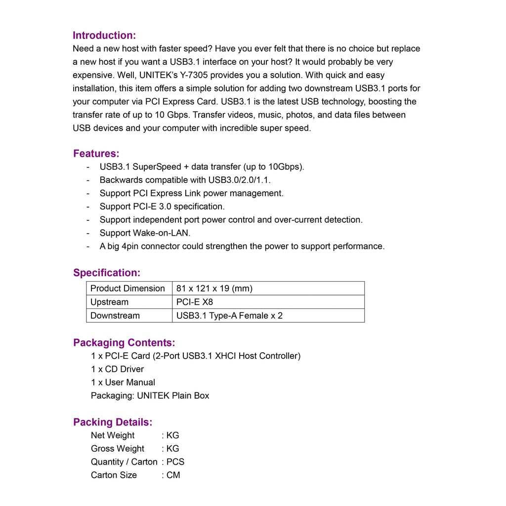 Card PCI Express sang 2 USB 3.1 Unitek Y 7305Đặc trưng: