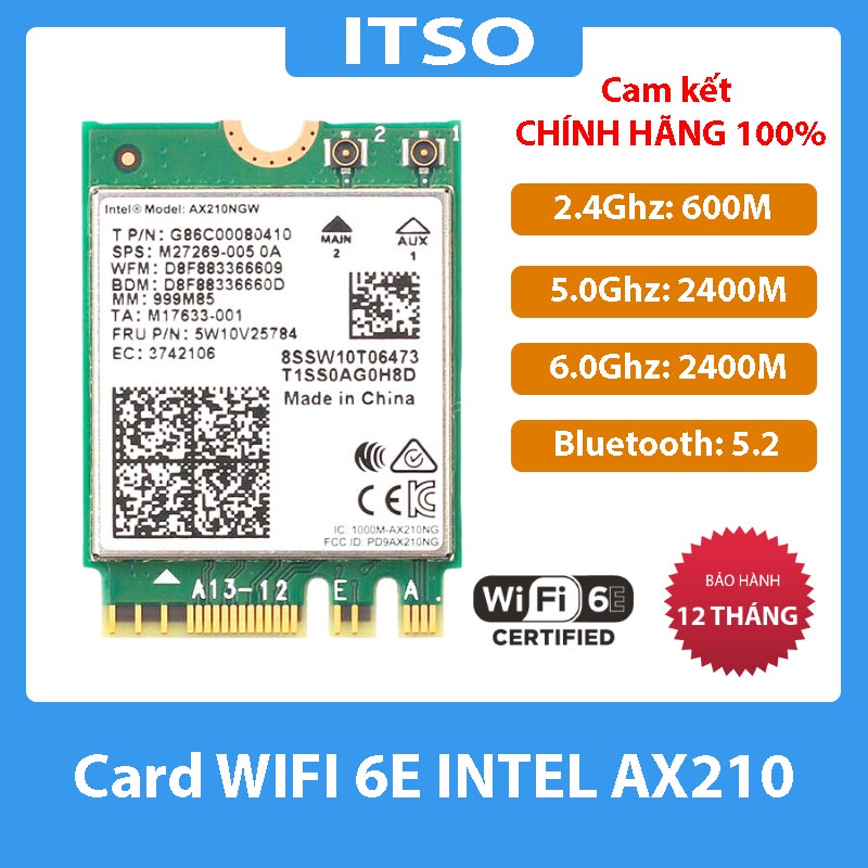 - Intel WIFI-6E AX210 GIG+ :Tốc độ tối đa 2400M. Bluetooth 5.2 có MU MIMO - Hỗ trợ 2.4Ghz 5Ghz (2400M) và 6Ghz (2400M)