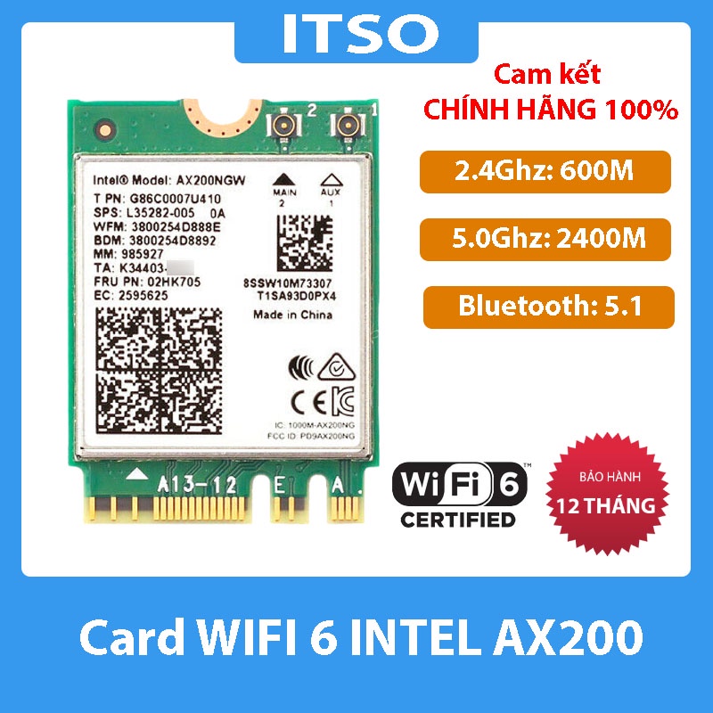 - Intel WIFI-6 AX200 GIG+ :Tốc độ tối đa 2400M. Bluetooth 5.1 có MU MIMO - Hỗ trợ 2.4Ghz 5Ghz (2400M)