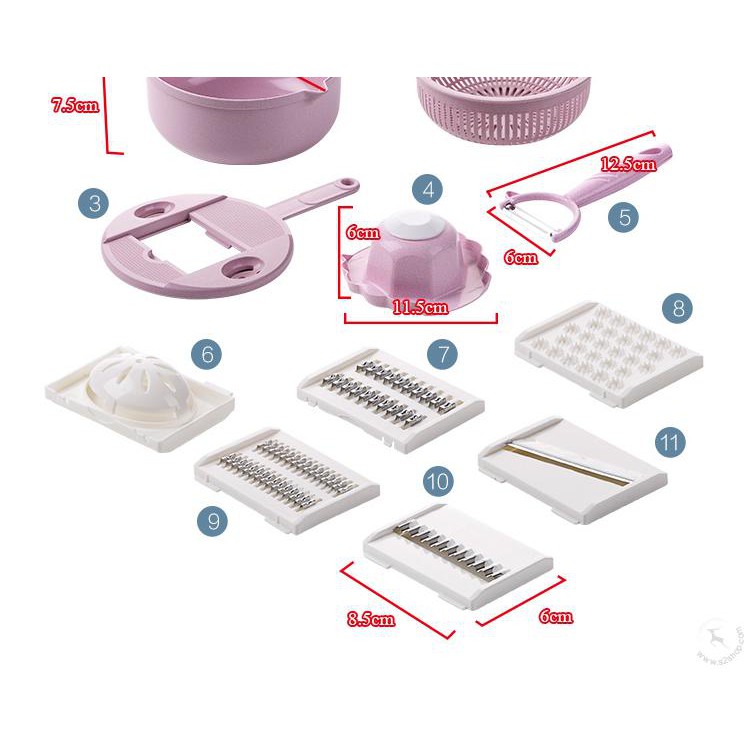 - Bộ sản phẩm gồm: 01 hộp chứa + 01 rổ + 01 dụng cụ mài và lọc trứng + 01 Dụng cụ giữ củ quả + 01 dụng cụ giữ lưỡi bào thái với 04 lưỡi bào cắt thái các kiểu.