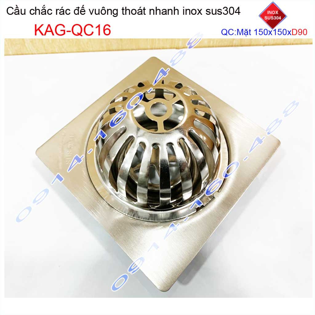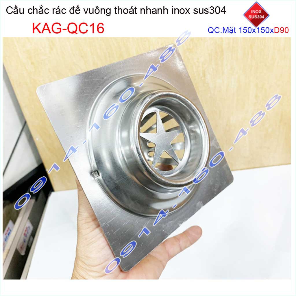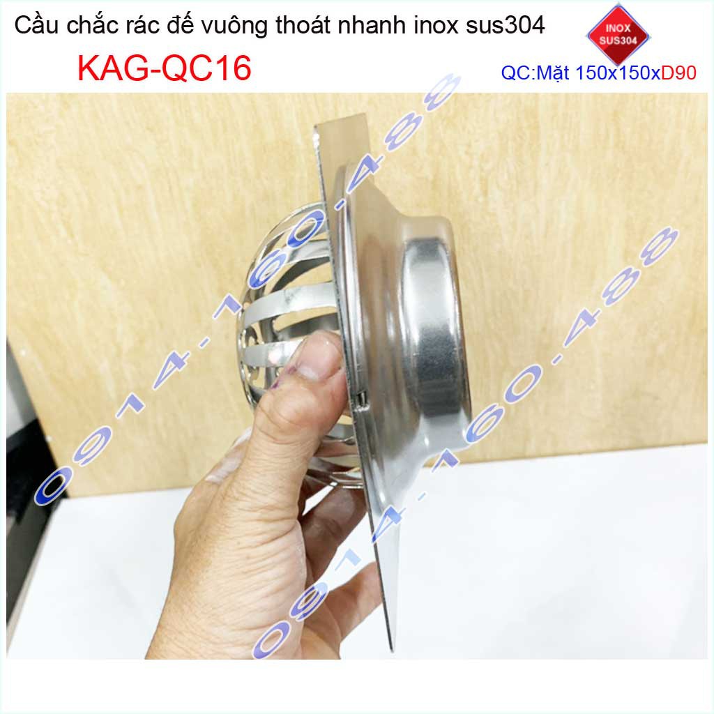 Cầu chắn rác đế vuông 15x15cm D90 KAG-QC16, Phễu thoát nước sân thượng SUS304 ống 9cm thoát nhanh chắn rác tốt