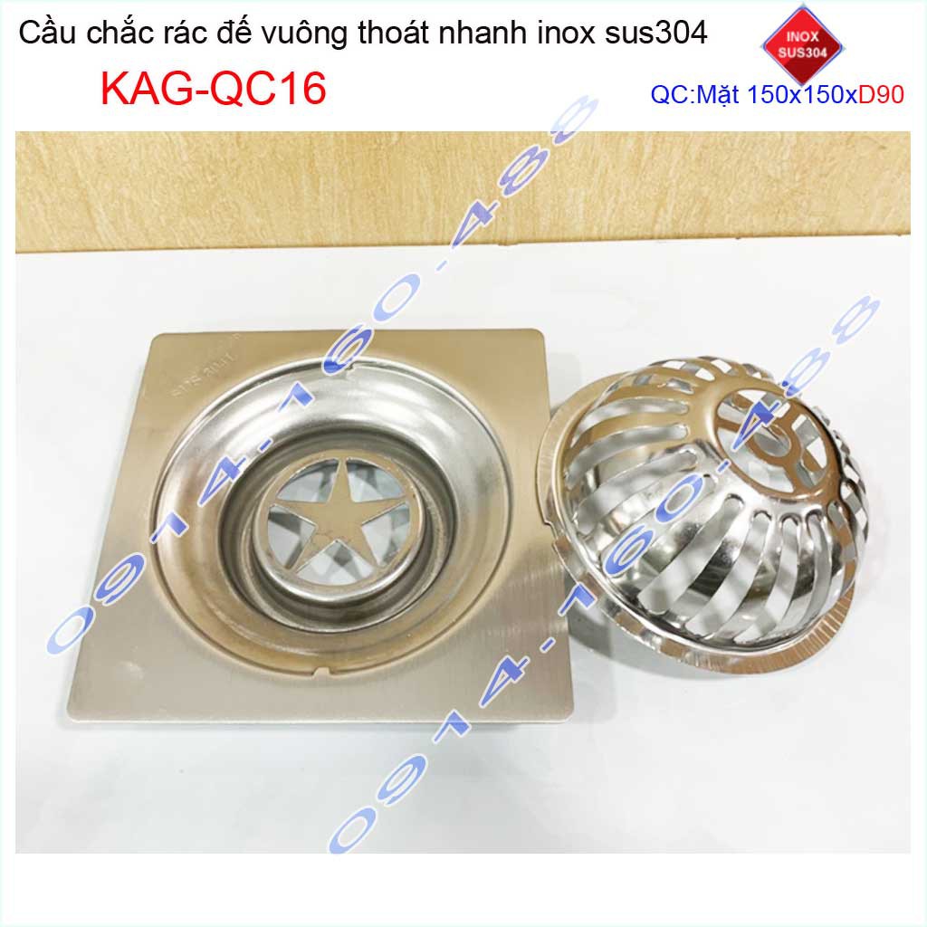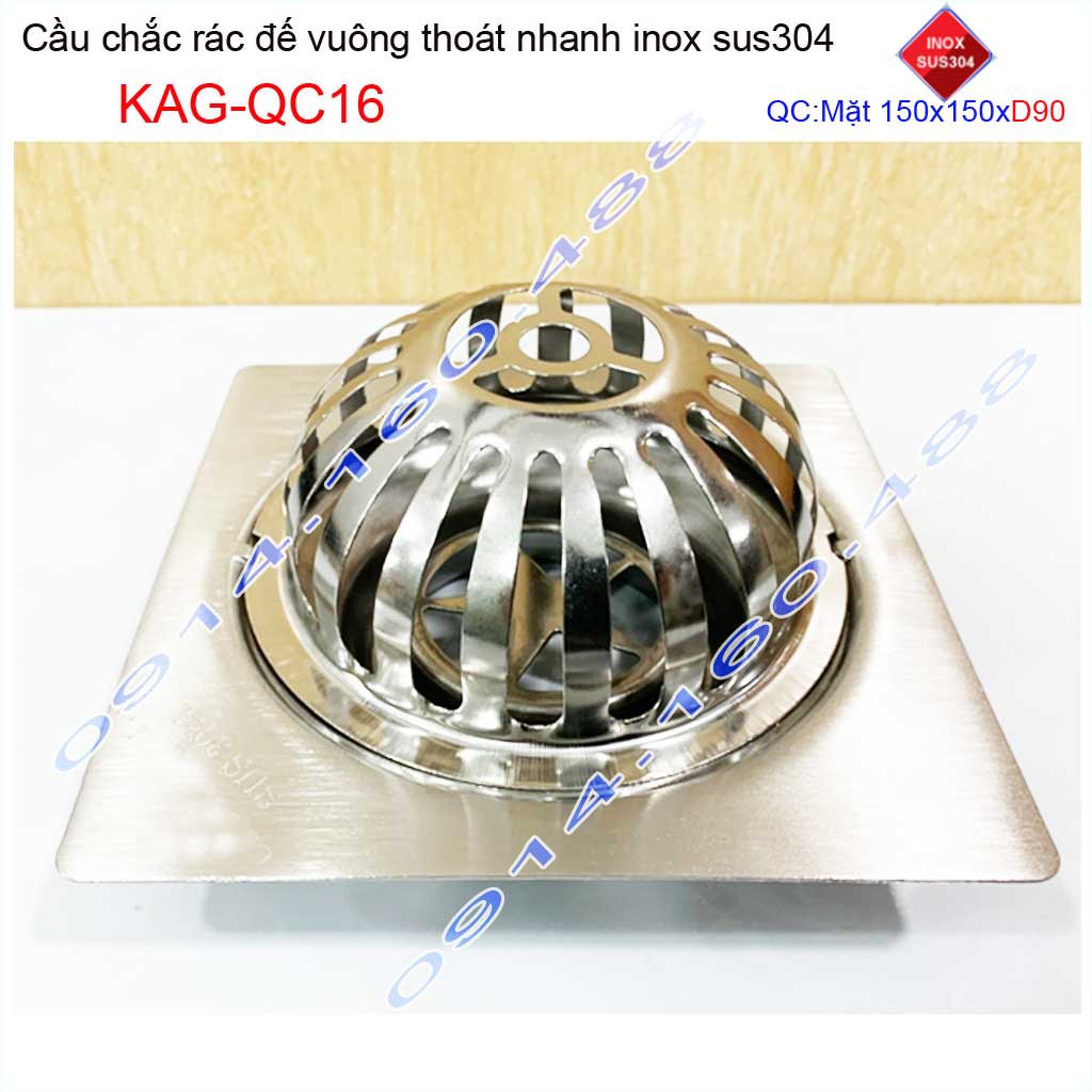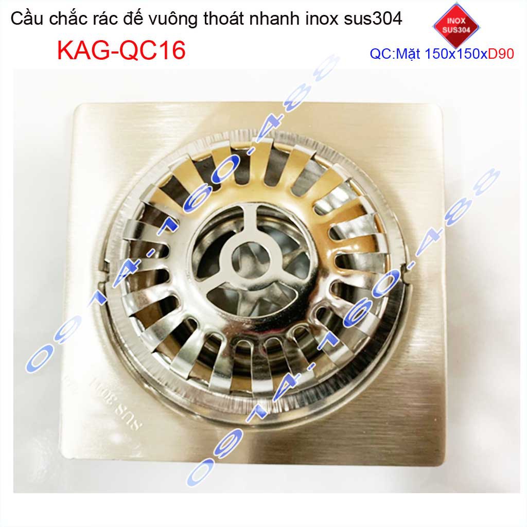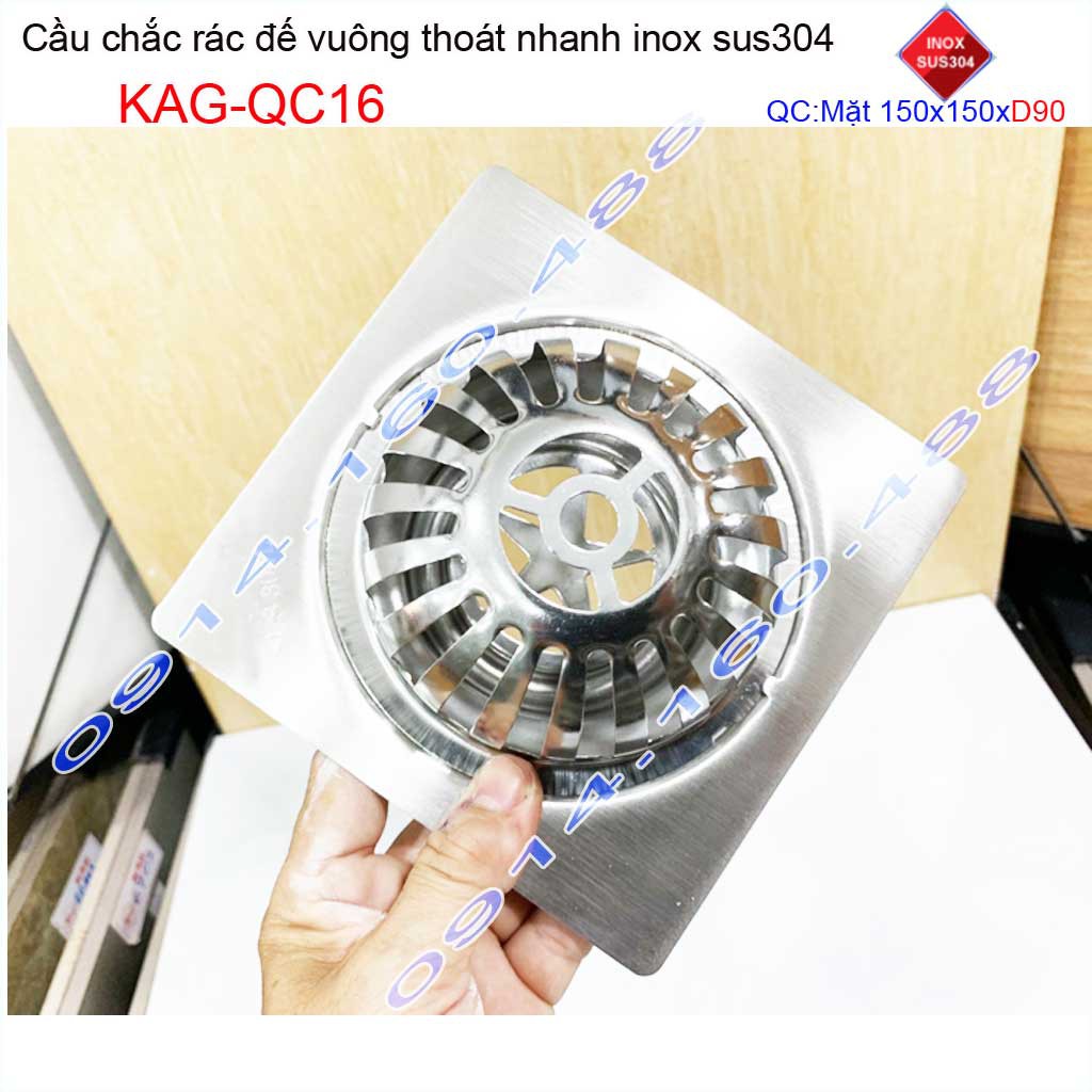 Cầu chắn rác đế vuông 15x15cm D90 KAG-QC16, Phễu thoát nước sân thượng SUS304 ống 9cm thoát nhanh chắn rác tốt