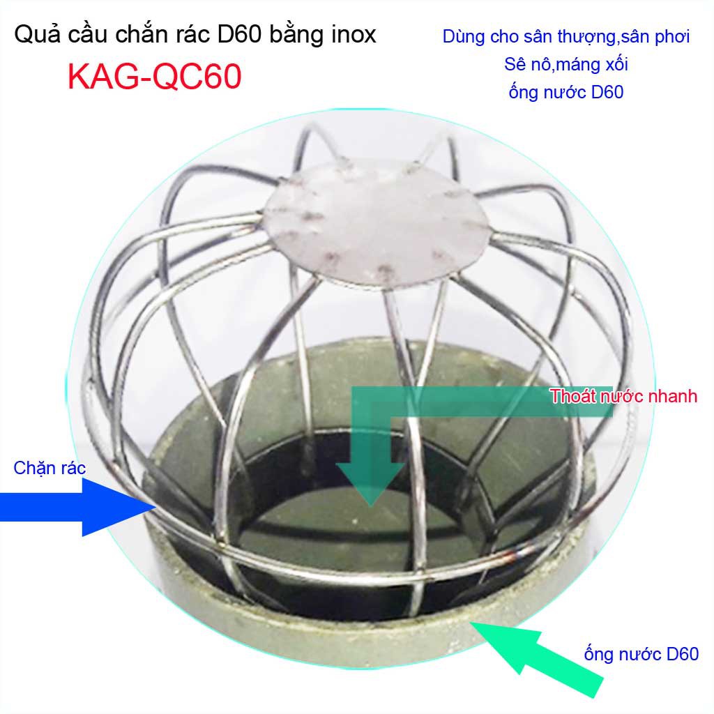 Cầu chặn rác sân thượng KAG-QC60, cầu chắn rác inox 201 thoát nước mưa thả ống D60 xả nhanh chặn rác tốtChất liệu: Cầu chặn rác sân thượng inox, cầu chắn rác D60 KAG-QC60 sản xuất Inox 201 Việt Nam