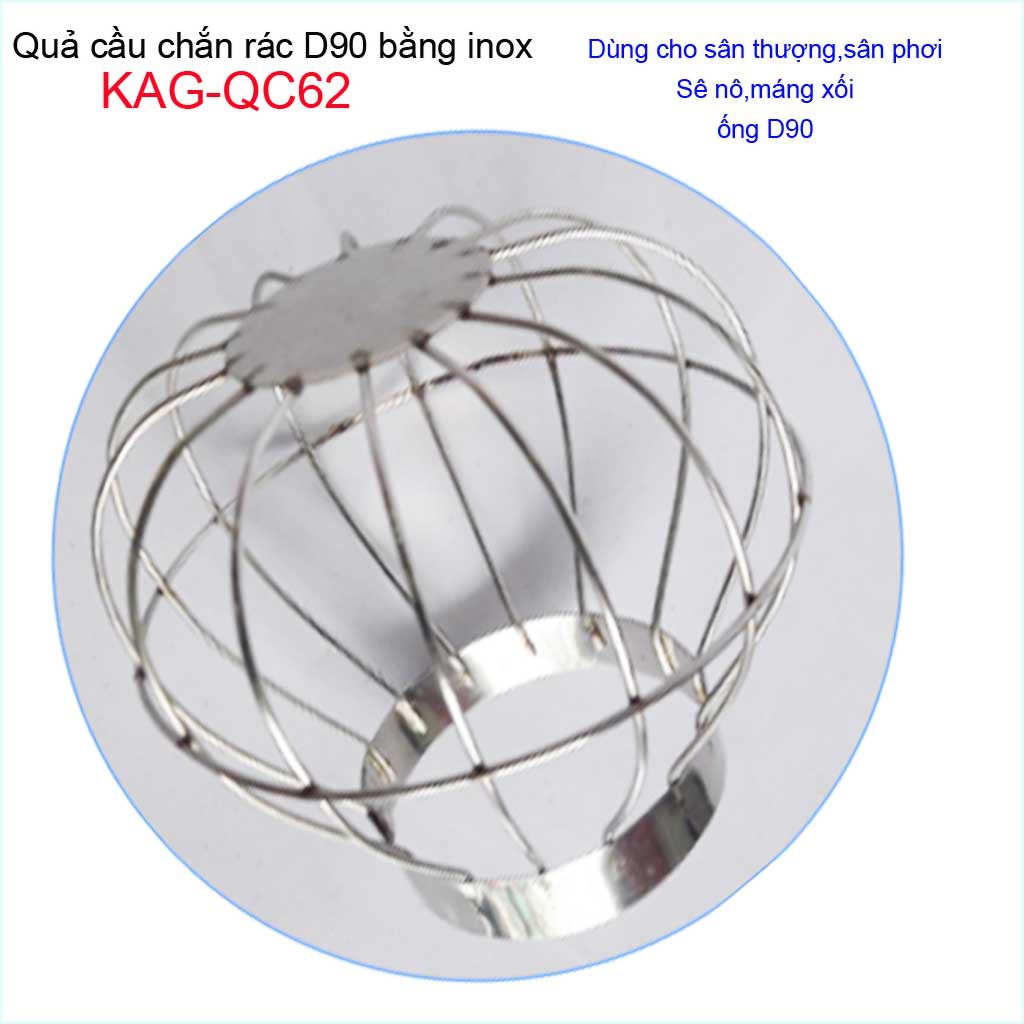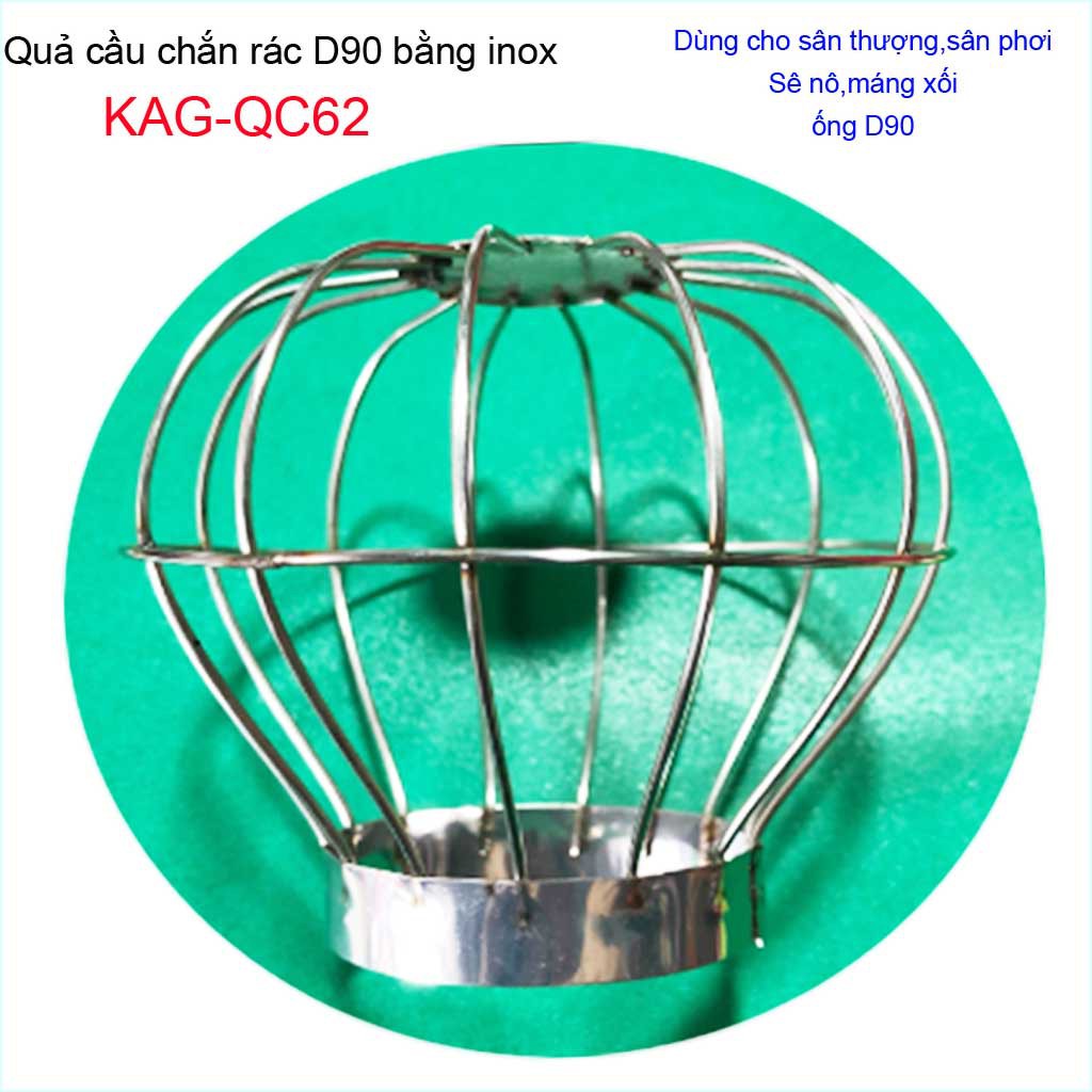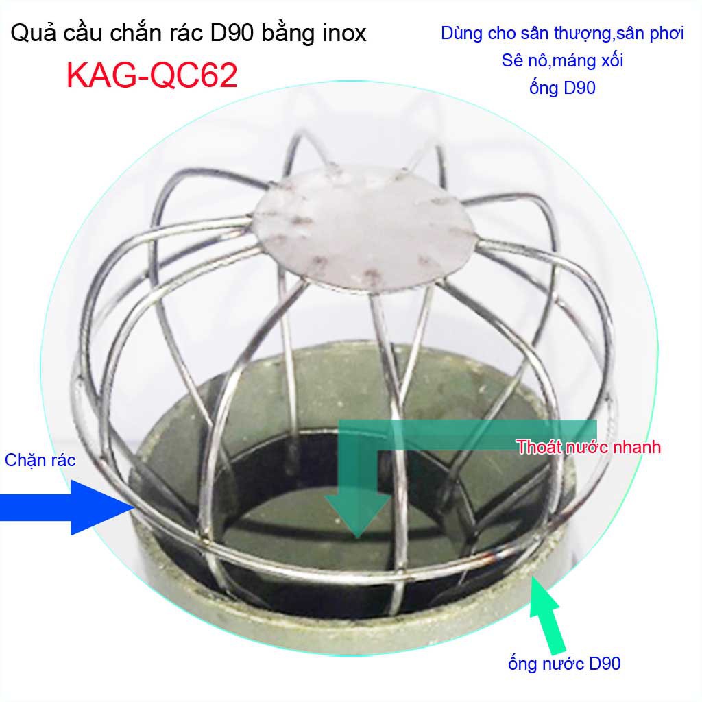 Cầu chặn rác sân thượng KAG-QC62, cầu chắn rác inox 201 thoát nước mưa thả ống D90 xả nhanh chặn rác tốtChất liệu: Cầu chặn rác sân thượng inox, cầu chắn rác D90 KAG-QC62 sản xuất Inox 201 Việt Nam