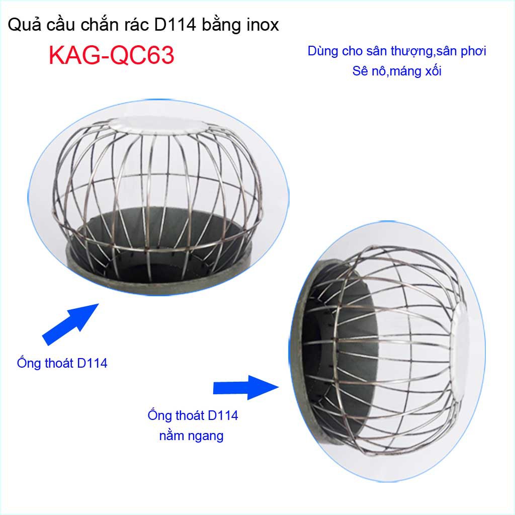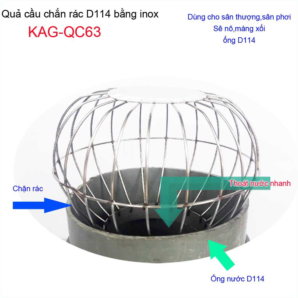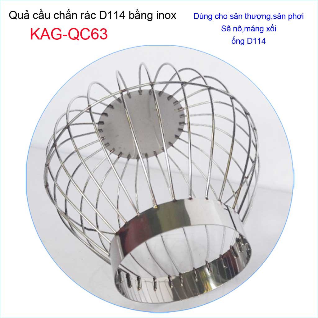 Cầu chặn rác sân thượng KAG-QC63, cầu chắn rác inox 201 thoát nước mưa thả ống D114 xả nhanh chặn rác tốtChất liệu: Cầu chặn rác sân thượng inox, cầu chắn rác D114 KAG-QC63 sản xuất Inox 201 Việt Nam