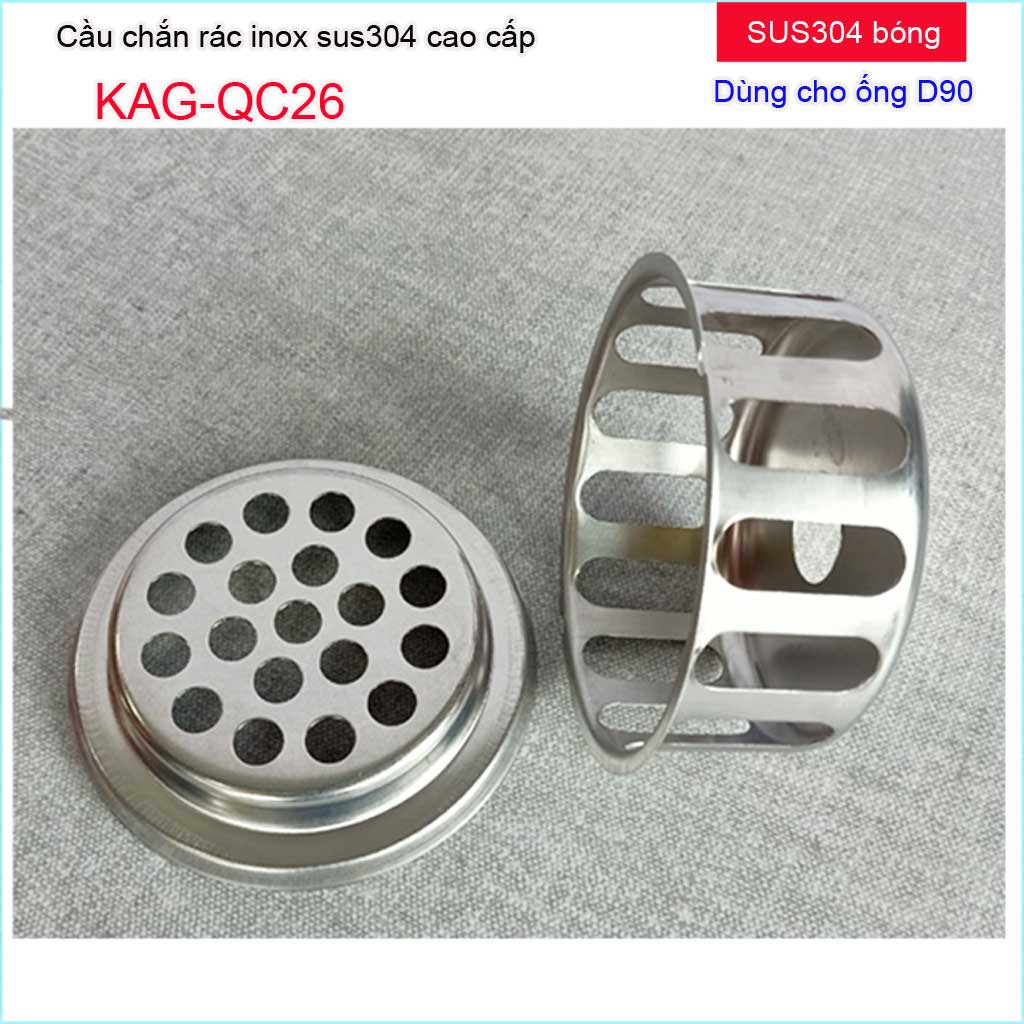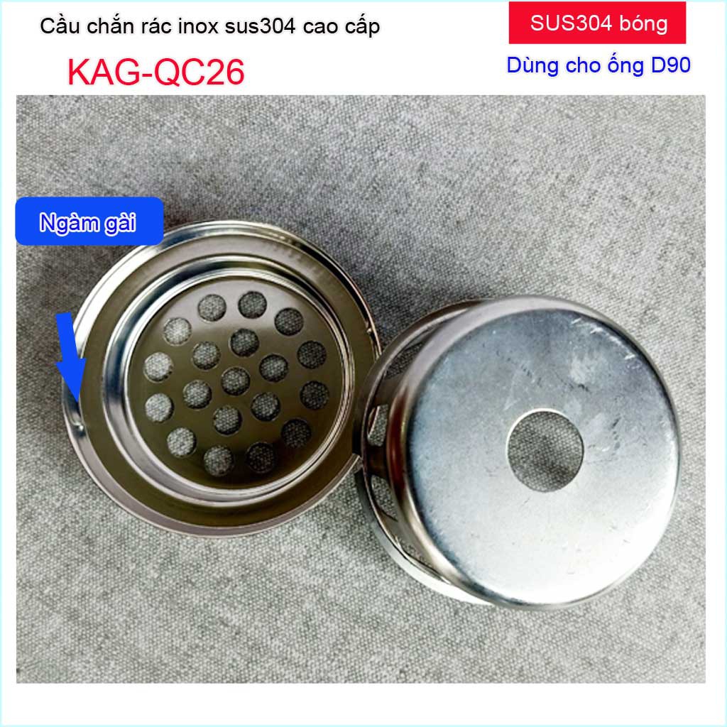 Cầu chắn rác sân thượng inox SUS304, cầu chắn rác, cầu thoát nước mưa KAG-QC26(D90) dùng cho ống thoát nước đường kính 9cm(90mm). Lắp trực tiếp vào ống thoát nước