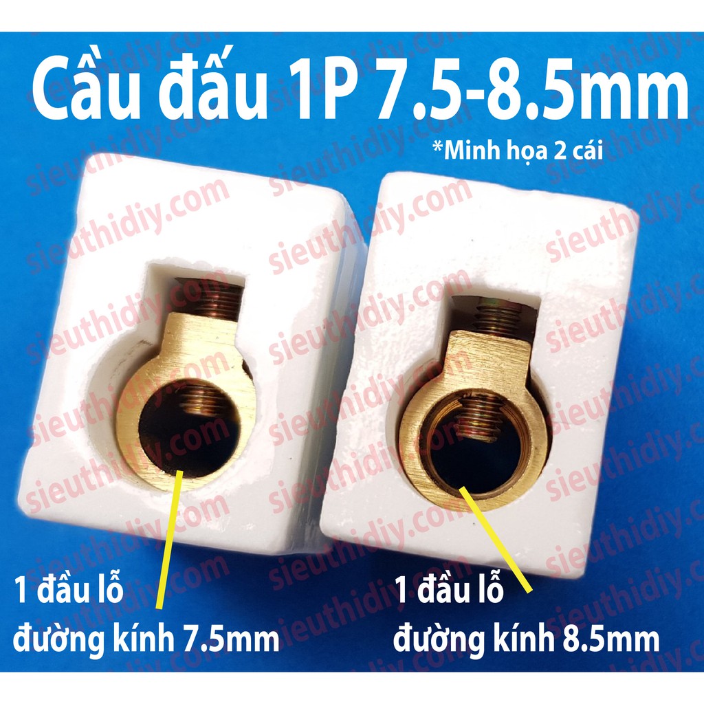+ 7.5-8.5mm: chịu dòng 100A -dài 43m * rộng 33m * cao 27mm (2P) hoặc 33x20x28mm (1P) - lỗ domino đồng 1 đầu phi 7.5mm, 1 đầu phi 8.5mm.