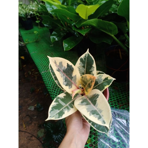 Lá cây có viền trắng đỏ, xen lẫn vào phần xanh của lá là những vết loan nhẹ màu trắng hồng trông rất bắt mắt.