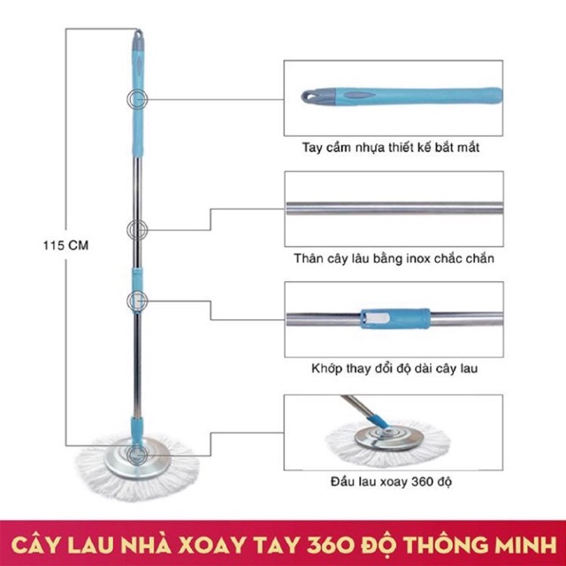 Bộ cây lau nhà xoay tay 360 độ thông minh Inox có bánh xe là một trong những vật dụng cần thiết trong mỗi gia đình. Sản phẩm có bánh xe sẽ giúp bạn giữ nhà cửa luôn khô thoáng và lau sạch mọi bụi bẩn và còn giúp làm sạch cả những góc khuất khó lau dọn như gầm giường, gầm tủ, bàn, ghế… Hãy lựa chọn sản phẩm Bộ cây lau nhà xoay tay 360 độ thông minh lồng Inox có bánh xe, bạn sẽ hài lòng cả về chất lượng lẫn kiểu dáng nhé.