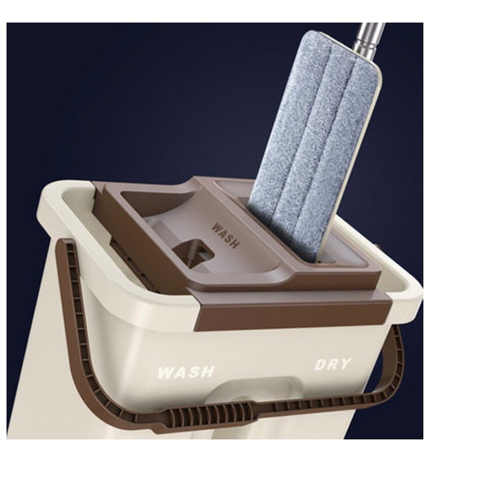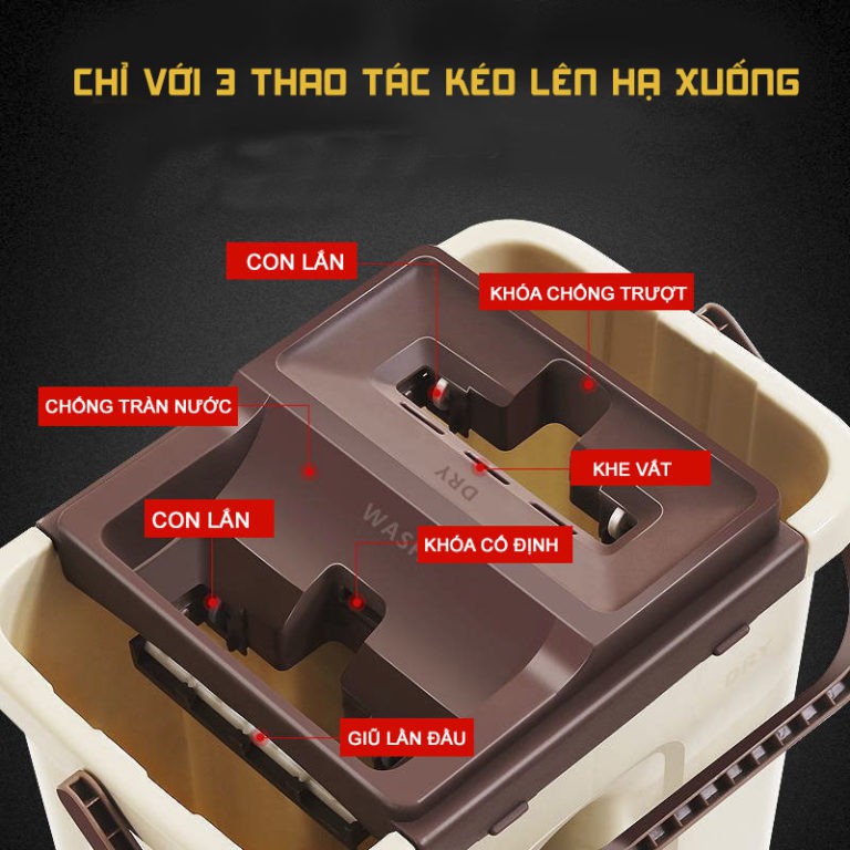 - Hệ thống buồng kép 2 thanh gạt thông minh 1 bên giặt sạch 1 bên vắt khô thao tác dễ dàng nhanh chóng. Có khả năng vắt siêu sạch giúp loại bỏ vi khuẩn và nấm mốc trên bông lau nhà.