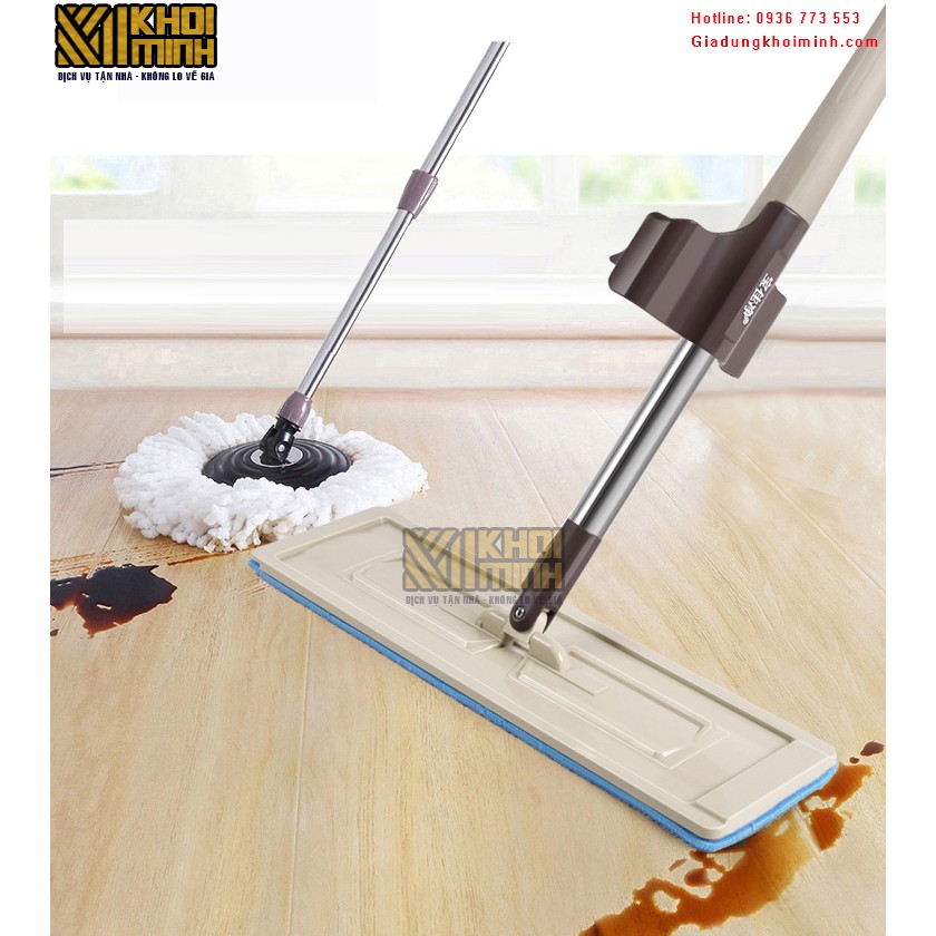 - Cây lau nhà Chổi lau nhà tự vắt phẳng thế hệ mới xoay 360 độ với thiết kế thông minh với đầu lau sàn hình chữ nhật tạo nên lực ly tâm lớn, giúp nhẹ nhàng lau sạch mọi bụi bẩn trên sàn nhà hay mọi ngõ ngách, góc hẹp trong ngôi nhà bạn một cách nhanh chóng và sạch sẽ.- Thân Cây lau nhà Chổi lau nhà tự vắt được thiết kế gọn nhẹ, chắc chắn bằng chất liệu Inox bền đẹp với dạng vặn xoáy, sử dụng hệ rãnh trượt và lò xo nằm ngay bên trong thân lau tạo lực vắt mạnh, giúp người dùng chỉ cần xoay nhẹ tay đã có thể vắt khô miếng lau.