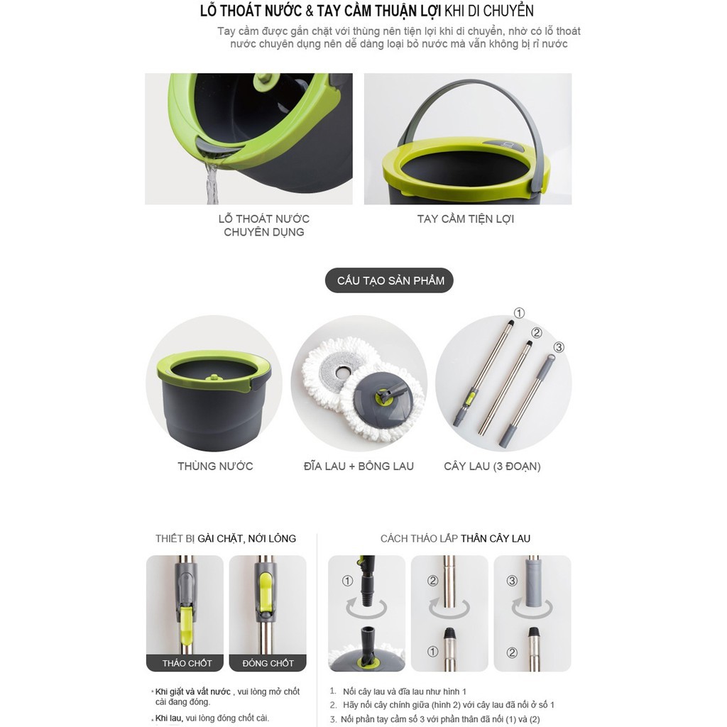 Thùng chứa được làm bằng chất liệu nhựa PP cao cấp, chất lượng, có khả năng chịu được va đập tốt, cho độ bền sử dụng lâu dài theo thời gian. Trên thùng lau còn được tích hợp quai cầm tiện lợi, giúp bạn dễ dàng di chuyển đến mọi vị trí.Phần bông lau được làm bằng bông microfiber, không xơ cứng nên không làm trầy xước bề mặt được lau. Sợi microfiber với khả năng thấm nước gấp 7 lần và khô nhanh gấp 3 lần so với các khăn lau thông thường khác giúp lau nhanh, sạch mọi ngóc ngách, ngay cả những nơi khó tiếp cận trong nhà.