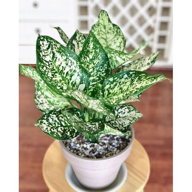 • Lá cây mềm, hình bầu dục, màu xanh đốm trắng khá nổi bật, vì tính tương phản giữa màu xanh thẫm của viền lá và màu trắng phần giữa lá. Chiều cao trung bình cây từ 20 – 40cm.
