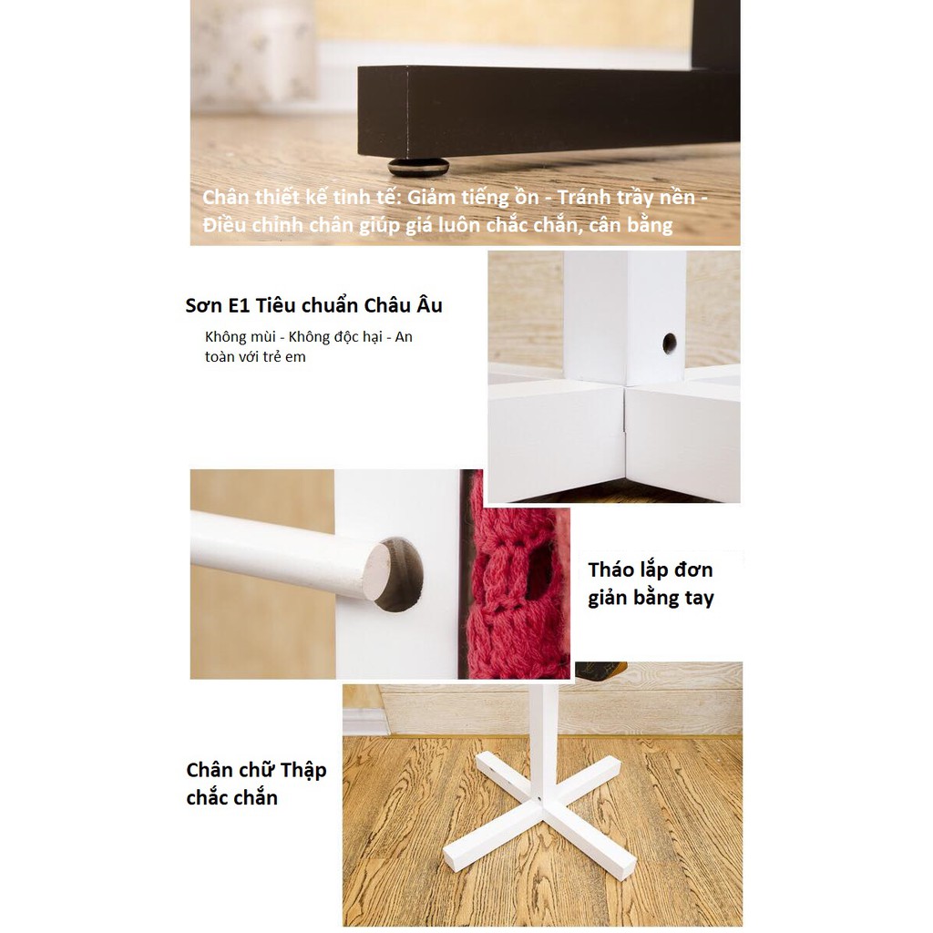 Sản phẩm gồm 1 cây treo đồ đứng có đầy đủ phụ kiện để lắp và tờ hướng dẫn chi tiết.Kích thước: chân dấu + ngang 45x45cm, gỗ được thiết kế vuông với cạnh 4x4cm đảm bảo chắc chắn tuyệt đối