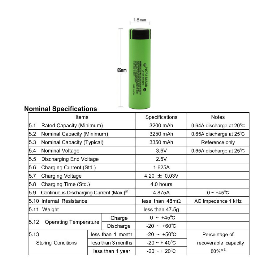 Thông số kỹ thuật pin: φ18 * 65 (mm).