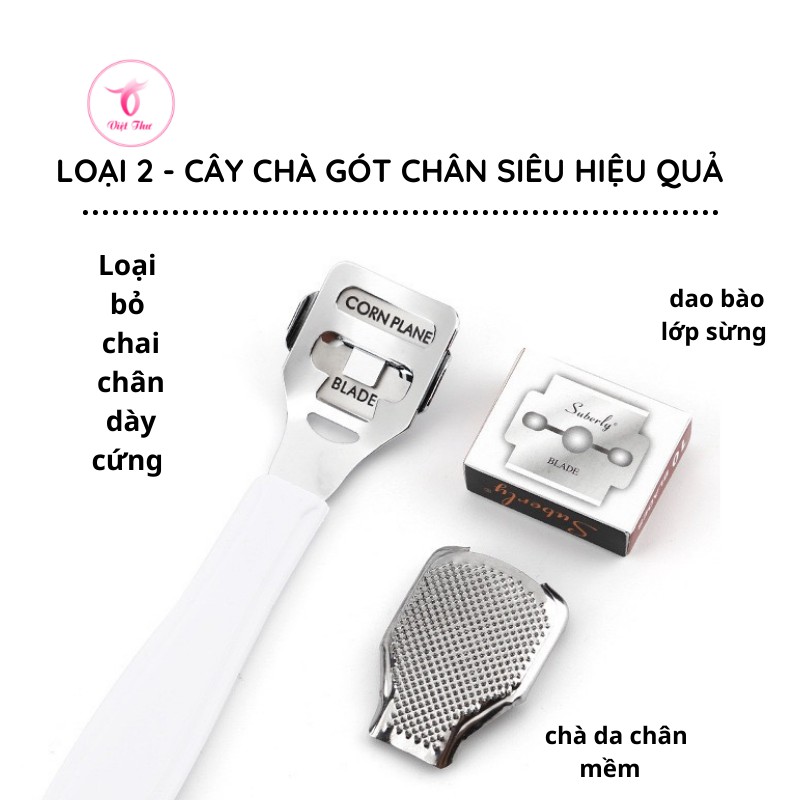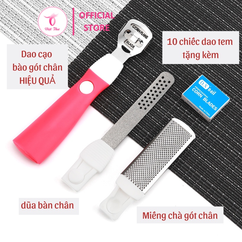 - Cây chà gót chân có thiết kế cực thông minh và sáng tạo, gồm 10 lưỡi dao bào miễn phí, mục đích chính là bào đi các lớp da dày thành từng lớp mỏng, và dần dần hết sạch.