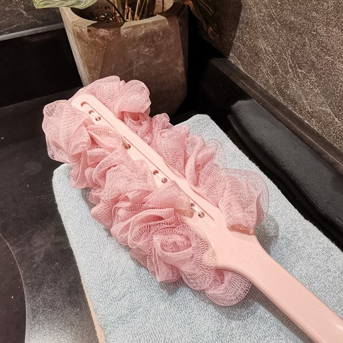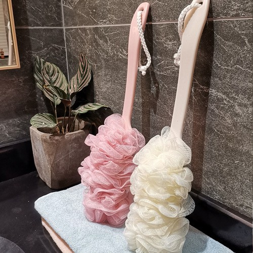 Giới thiệu Cây chà lưng cọ kèm bông tắm có tay cầm dài lưới mềm mại massage sạch mụn trắng da vệ sinh cơ thể màu xanh hồng