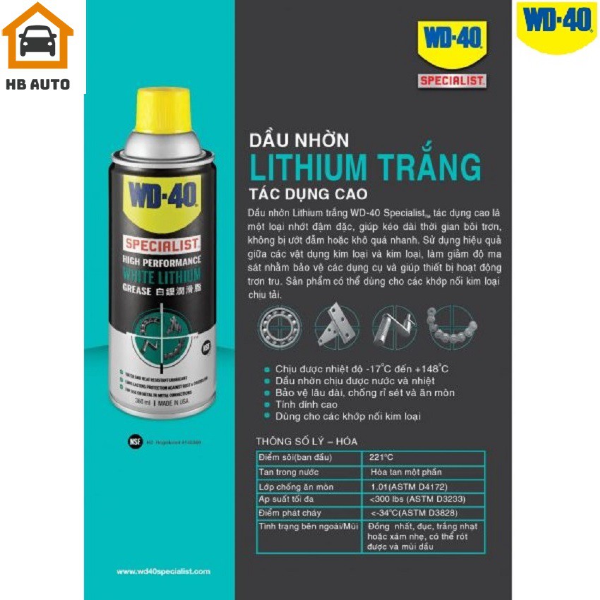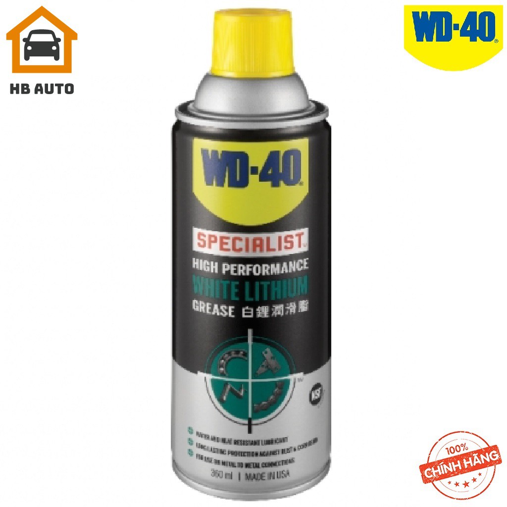 Chai Dầu nhờn bôi trơn tác dụng cao WD-40 Specialis High Performance White Lithium Grease (360ml)HB AUTO chuyên phân phối sản phẩm Dầu nhờn bôi trơn tác dụng cao WD-40 Specialis High Performance White Lithium Grease 360ml là một loại nhớt đậm đặc, giúp kéo dài thời gian bôi trơn, không bị ướt hoặc khô quá nhanh.