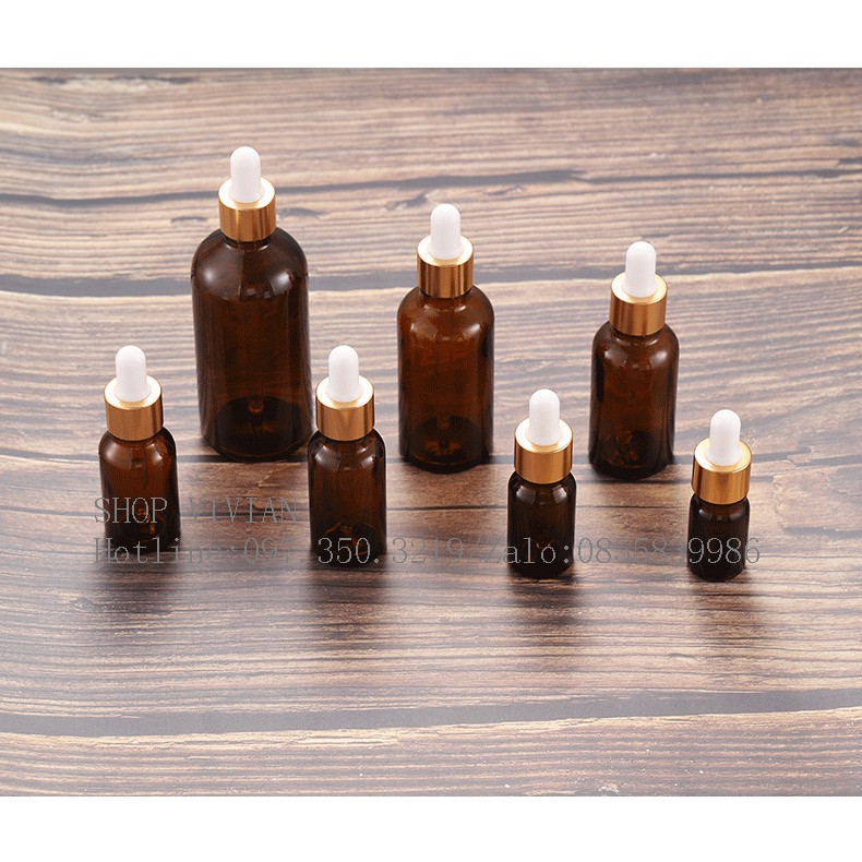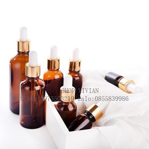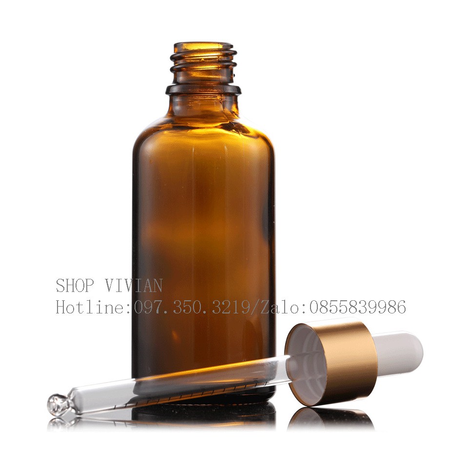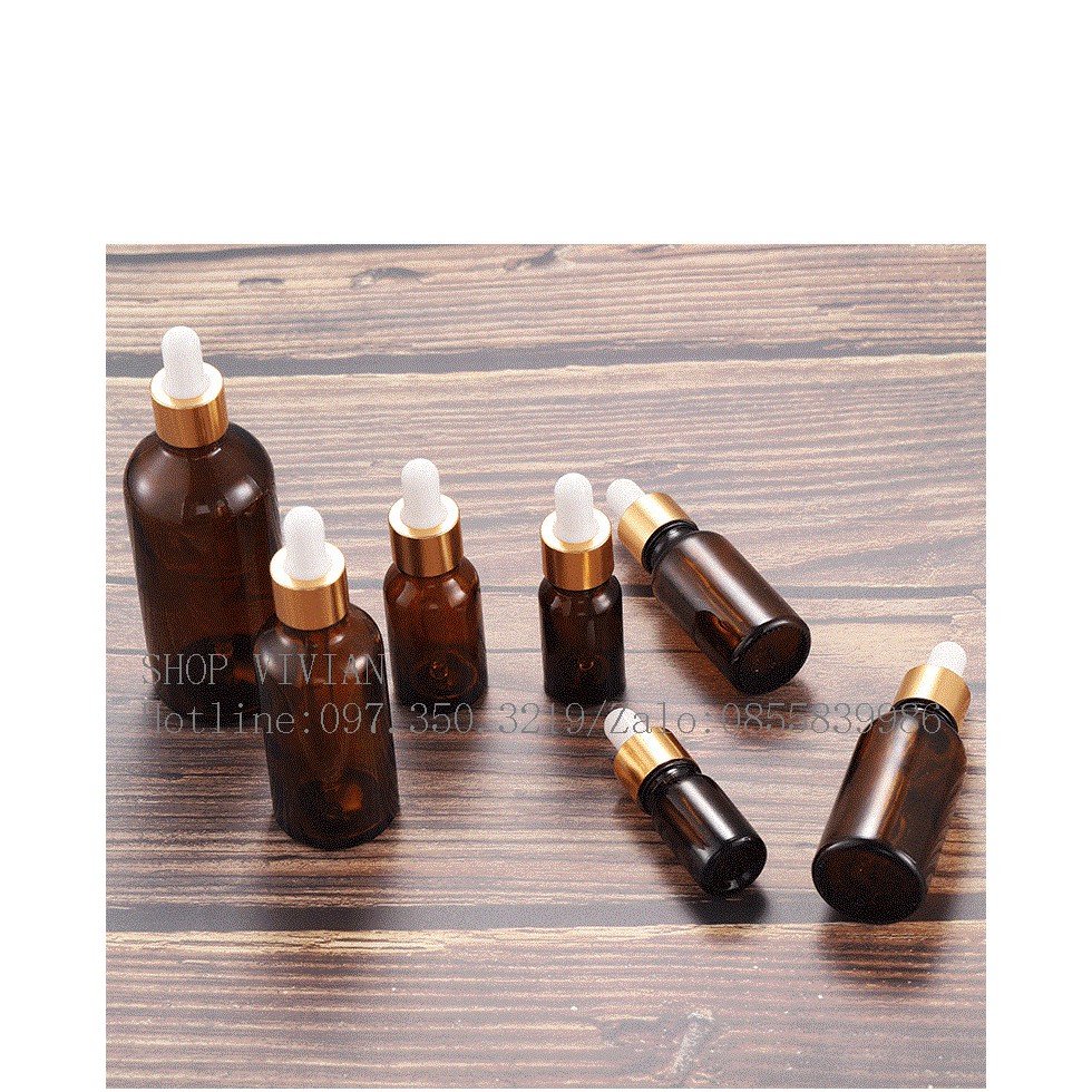 Giới thiệu Chai lọ đựng tinh dầu 50ml, lọ thuỷ tinh nâu nắp bóp nhôm vàng