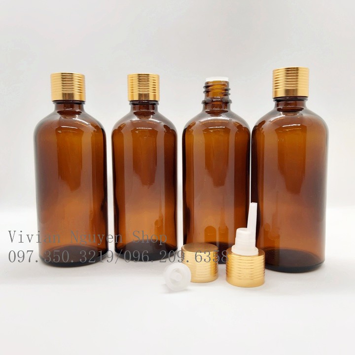 Giới thiệu Chai lọ đựng tinh dầu nhỏ giọt 100ml, thủy tinh màu nâu, nắp nhôm vàng {sỉ từ 5000đ