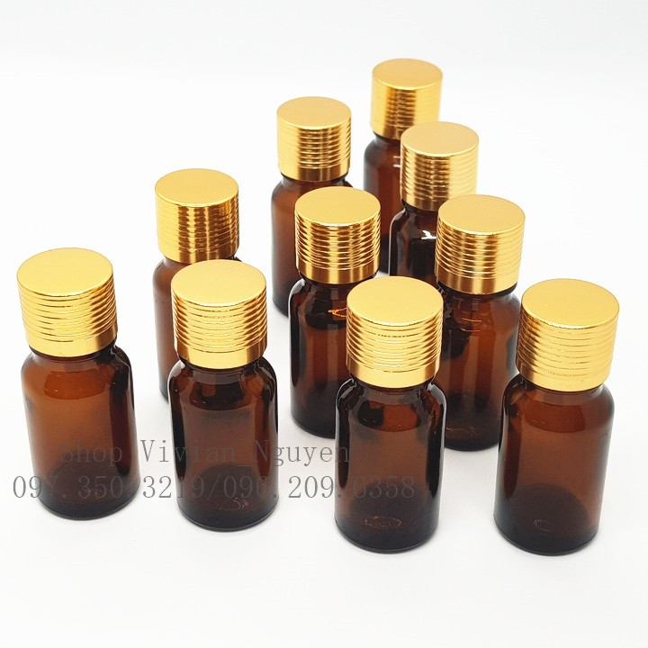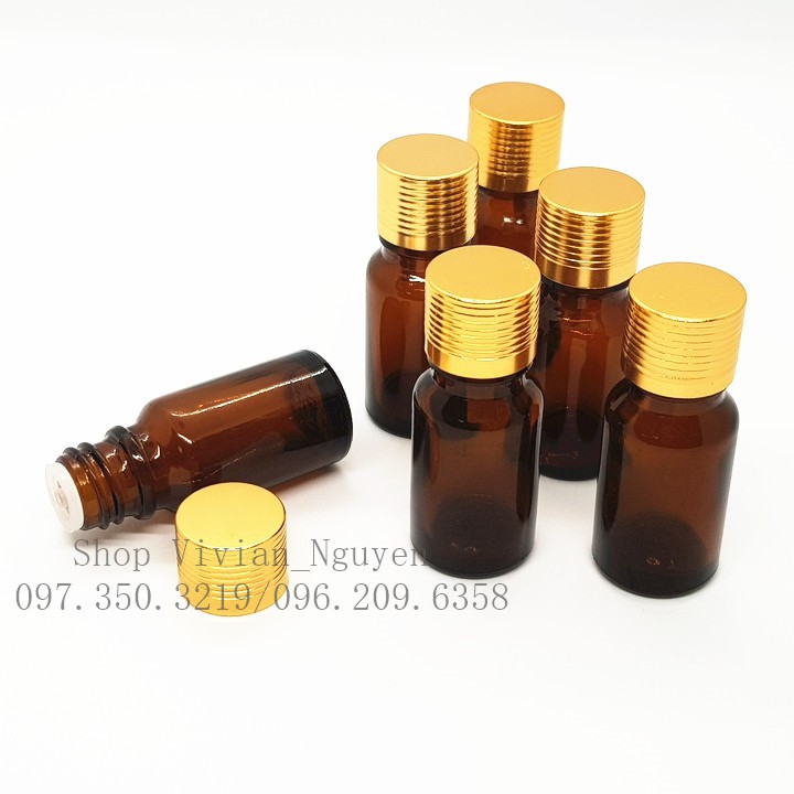 Chai đựng tinh dầu thủy tinh nâu 10ml , nắp màu nhôm vàng• Xuất xứ: Trung Quốc