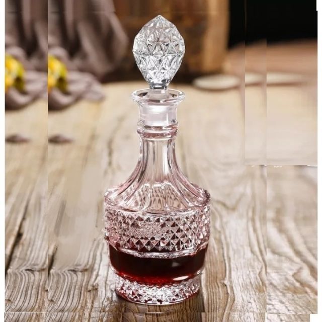 Chai đựng rượu thủy tinh được thiết kế kiểu dáng rất sang trọng, như bình rươu bầu, đầu nắp thủy tinh hình tròn bầu họa tiết kim cương lập thể, thân bình bầu tròn có hoa văn và khắc họa tiết sọc caro có hoa văn, kiểu dáng sang trọng, thủy tinh trong suốt.
