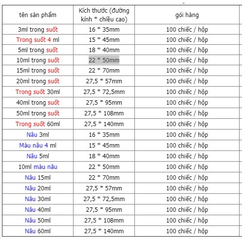 Kích thước chai thủy tinh 10ml: 22 * 50mm (Đường kính x chiều cao); 15ml: 22 * 70mm (Đường kính x chiều cao)