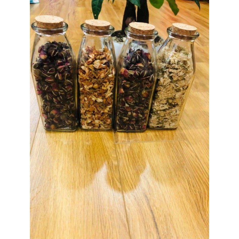 Dung tích: 350ml,Đường kính miệng: 4.2cm,Chiều cao: 15.8cm,Đường kính đáy: 5.5 cm,Nắp đậy: nút bầnChai thủy tinh vuông nút bần 350ml sử dụng nút gỗ ép