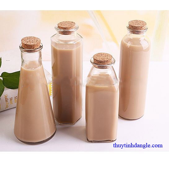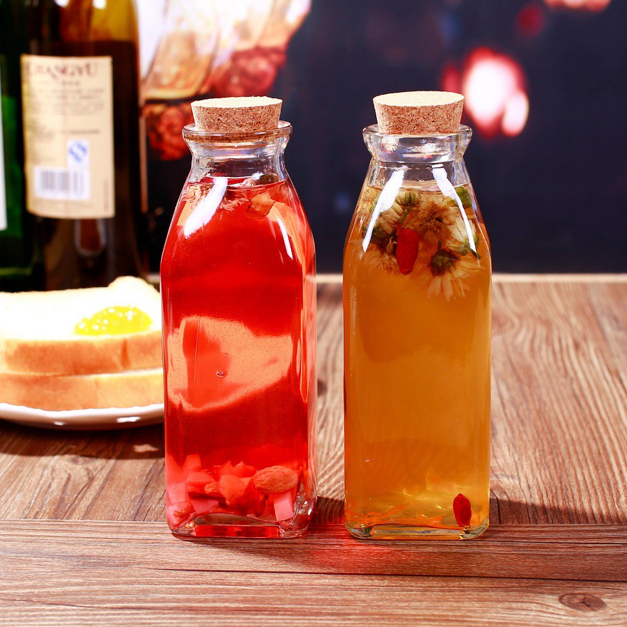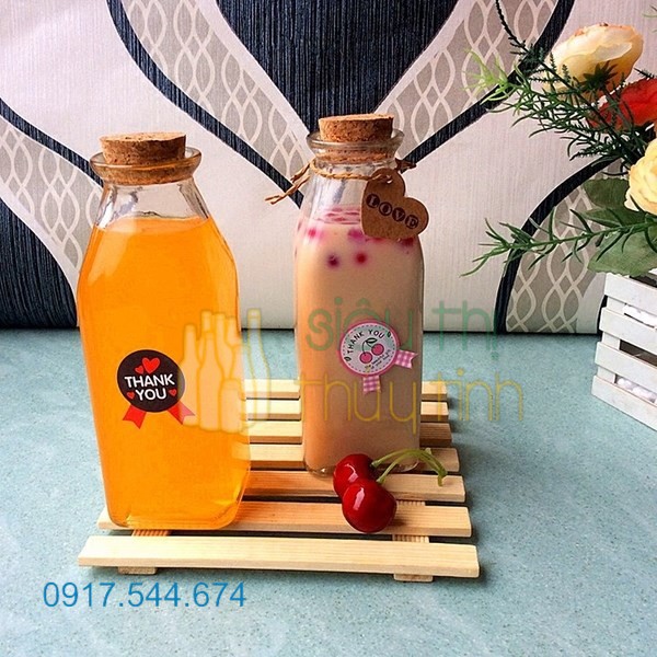 Chai thủy tinh vuông nút bần 350ml thường dùng đựng nước ép trái cây, sữa, sinh tố, trang trí quán ăn, quán cà phê…