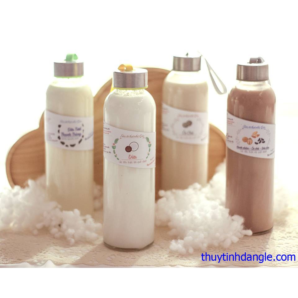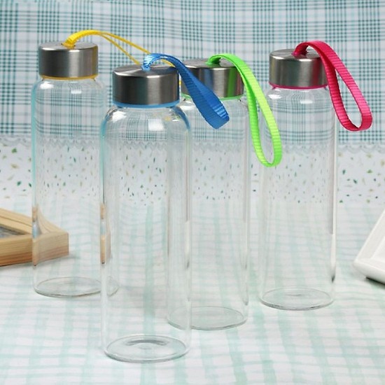 - Chai thủy tinh dây xách thể tích 500ml sử dụng nắp nhựa bọc inox, có gioăng cao su chống tràn, dây dù gắn trên đầu nắp.