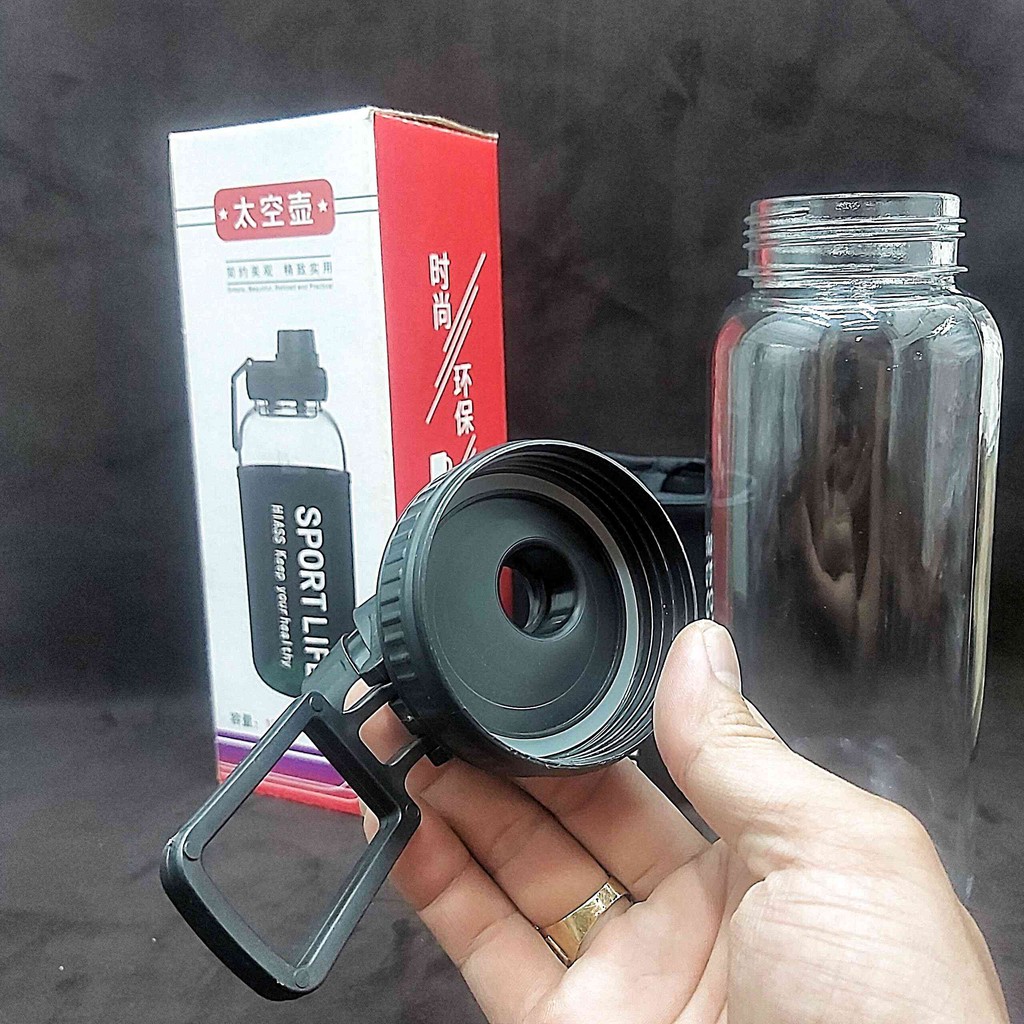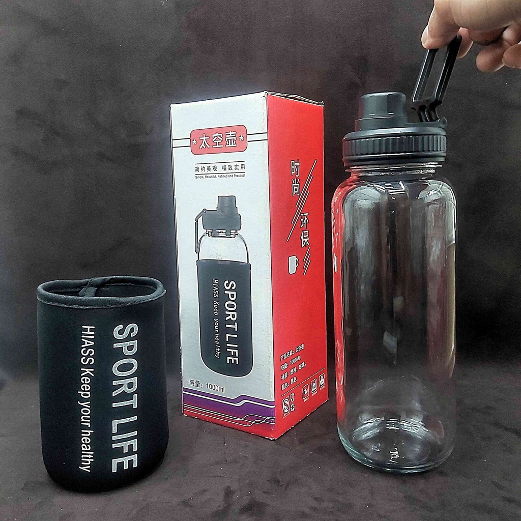 Nhà cửa & Đời sống > Bộ đồ bàn ăn > Bình nước & phụ kiện || Chai Thủy Tinh đựng nước 1000ml (combo 2 chai) SPORT LIFE - Nắp nhựa có quai, gioăng cao su– tặng kèm túi vải SpandexCòn hàng